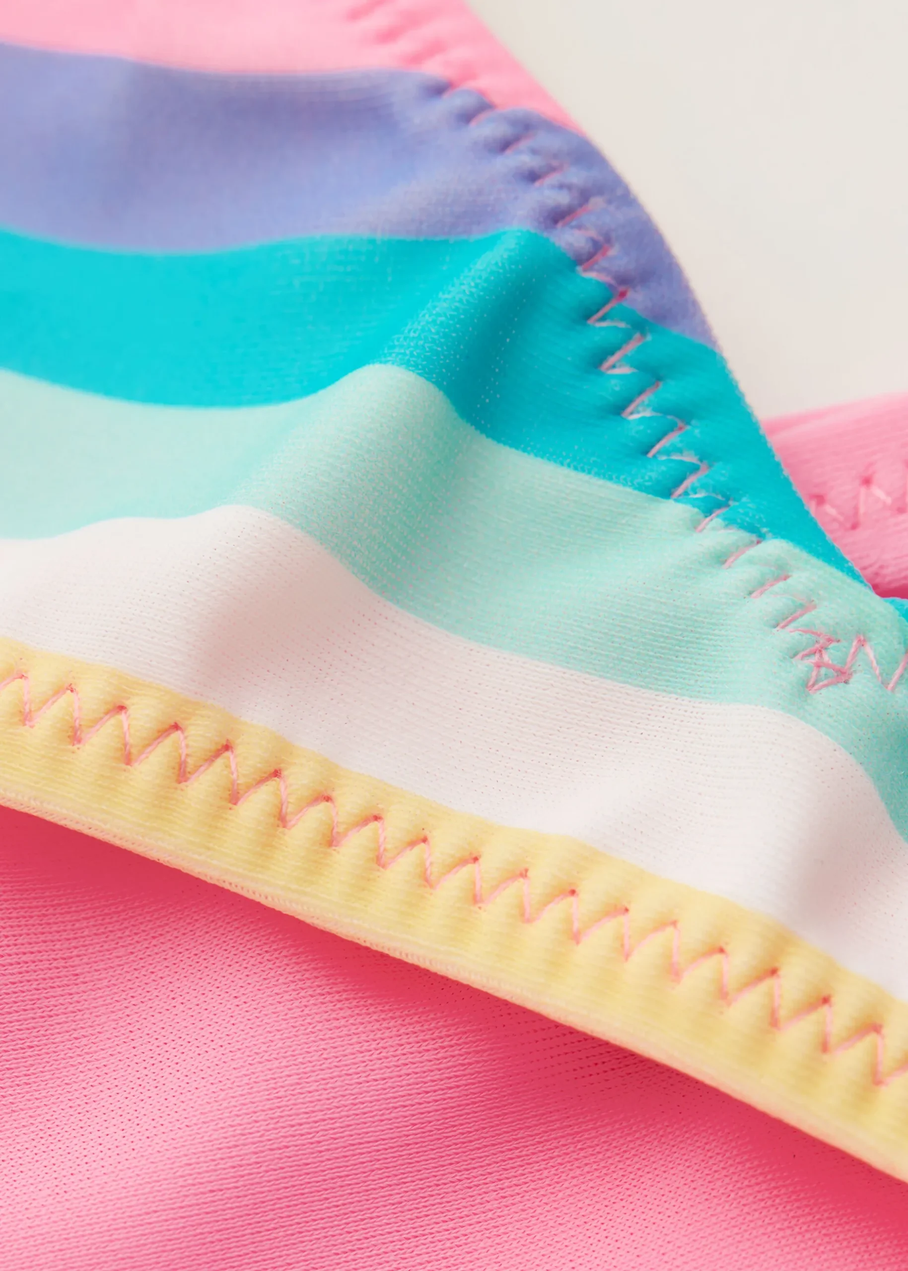 Girls’ Bikini With Triangle Top In Soft Microfibre With A Horizontal Stripe Pattern In Subtle Hues. One Adjustable Strap And Back Clasp Fastening. The Microfibre Shorts Have A Lined Gusset In Small Sizes, While Sizes 12-14 Are Fully Lined At The Front.