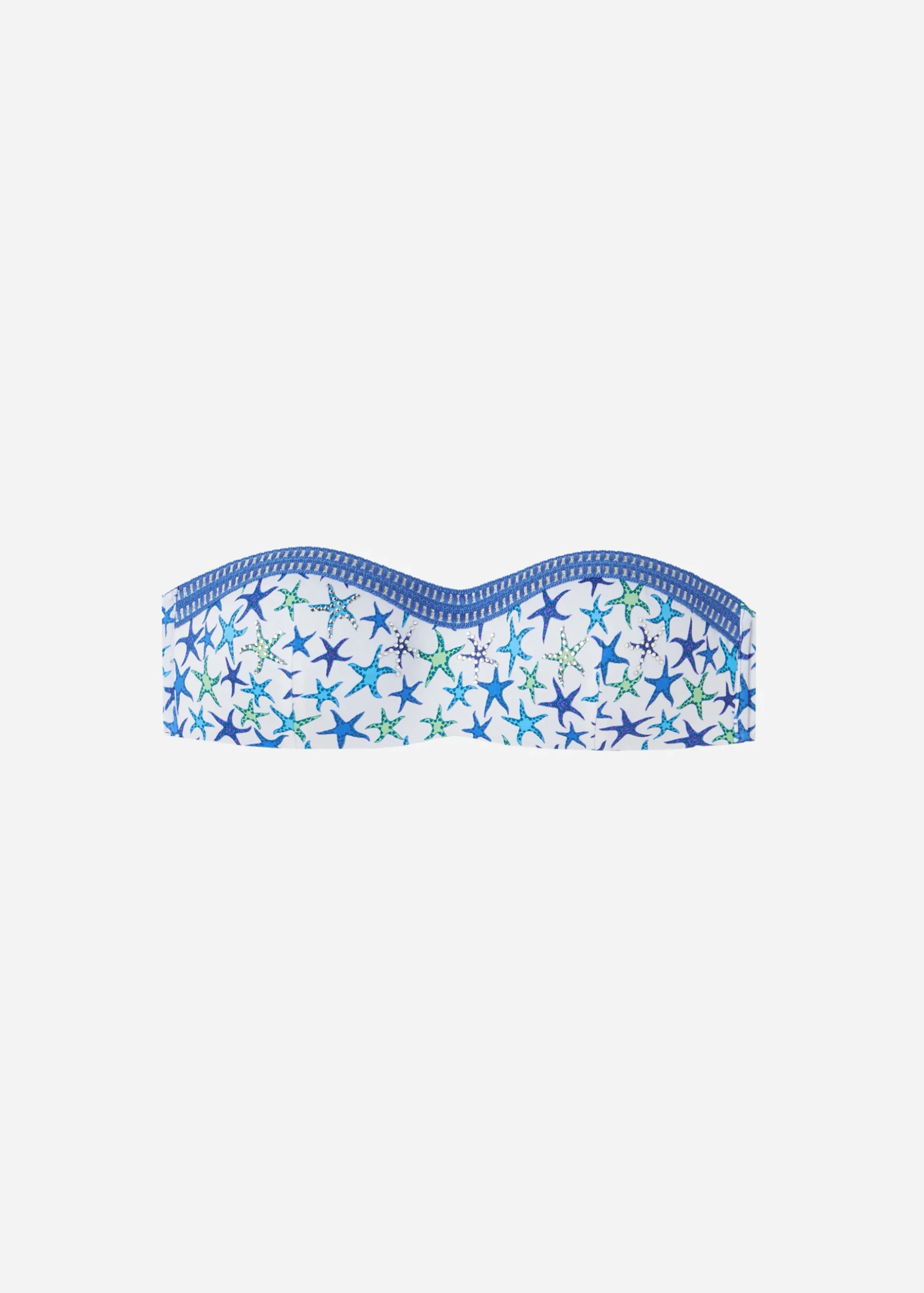 Bandeau Bikini Top With Graduated Padding To Increase The Volume Of The Bust And No Underwire For Maximum Comfort. The Side Boning Provides Good Support. The Style Features A Navy Star Pattern And Sparkly Rhinestones, While A Pretty Crochet Passementerie Adds Definition To The Edges. One Removable Shoulder Strap. Bow Fastening.