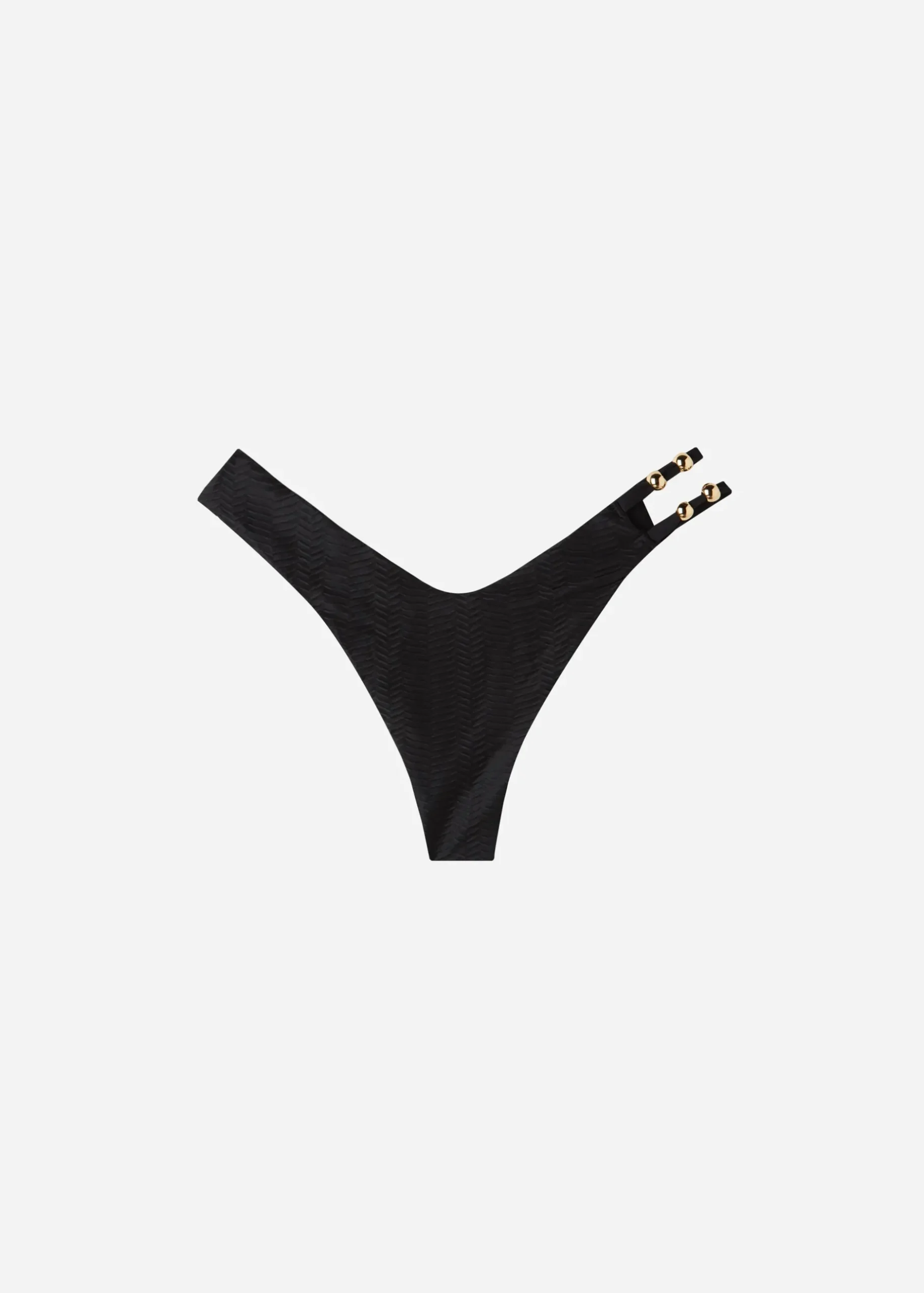 Brazilian Bikini Bottoms With V-Cut Front And Back Waistline And ’80S Style High Leg With Band And Ring Pattern On One Side. 3D Fabric With Super-Soft Chevron Effect, Embellished With Nickel-Free Golden Beads. Fully Lined. Central Seam At The Back To Ensure A Better Fit.