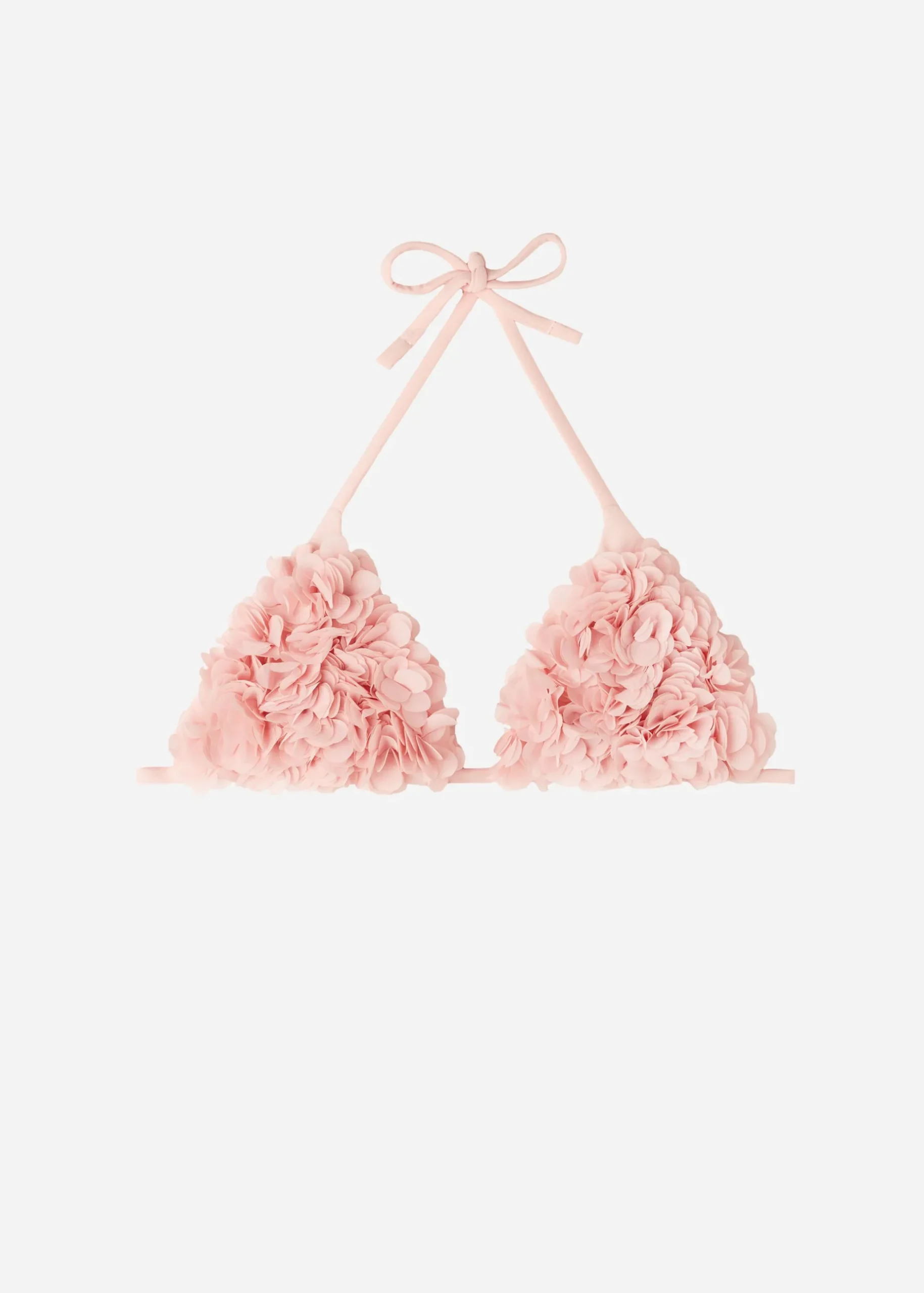 Slide Triangle Bikini Top With No Underwire For A Natural Effect. The Style Features A 3D Floral Decoration On The Cups For A Volume Effect. The Shoulder Straps Have Eyelets On The Ends So They Can Be Hooked Onto The Back Band Or Tied Around The Neck. Thin Tie Fastening At The Back.
