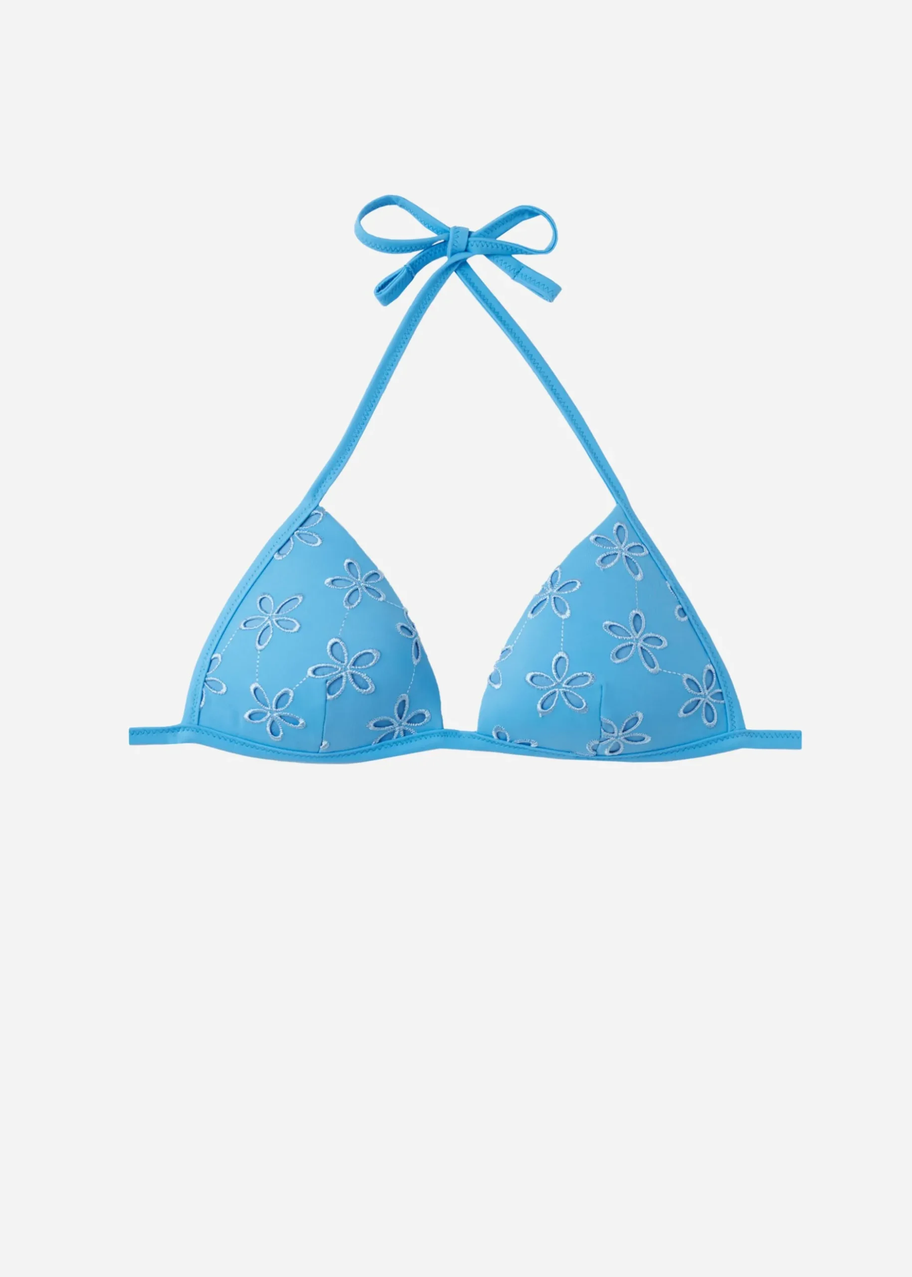 Non-Wired Fixed Triangle Bikini Top With Graduated Padded Cups That Add Volume To Enhance The Cleavage. The Style Features Elegant Broderie Anglaise Fabric. The Shoulder Straps Have Eyelets On The Ends So They Can Be Hooked Onto The Back Band Or Tied Around The Neck. Thin Tie Fastening At The Back.
