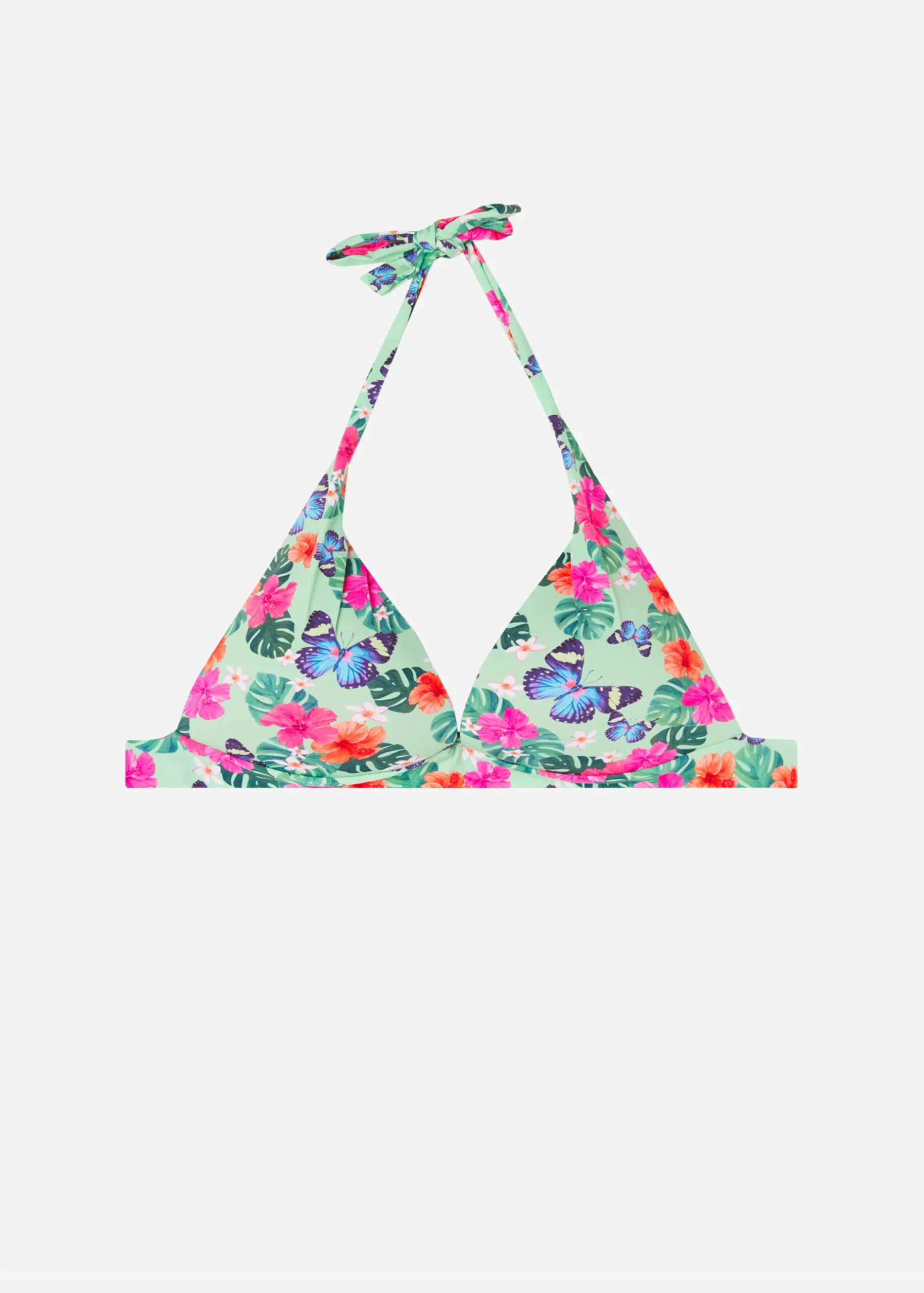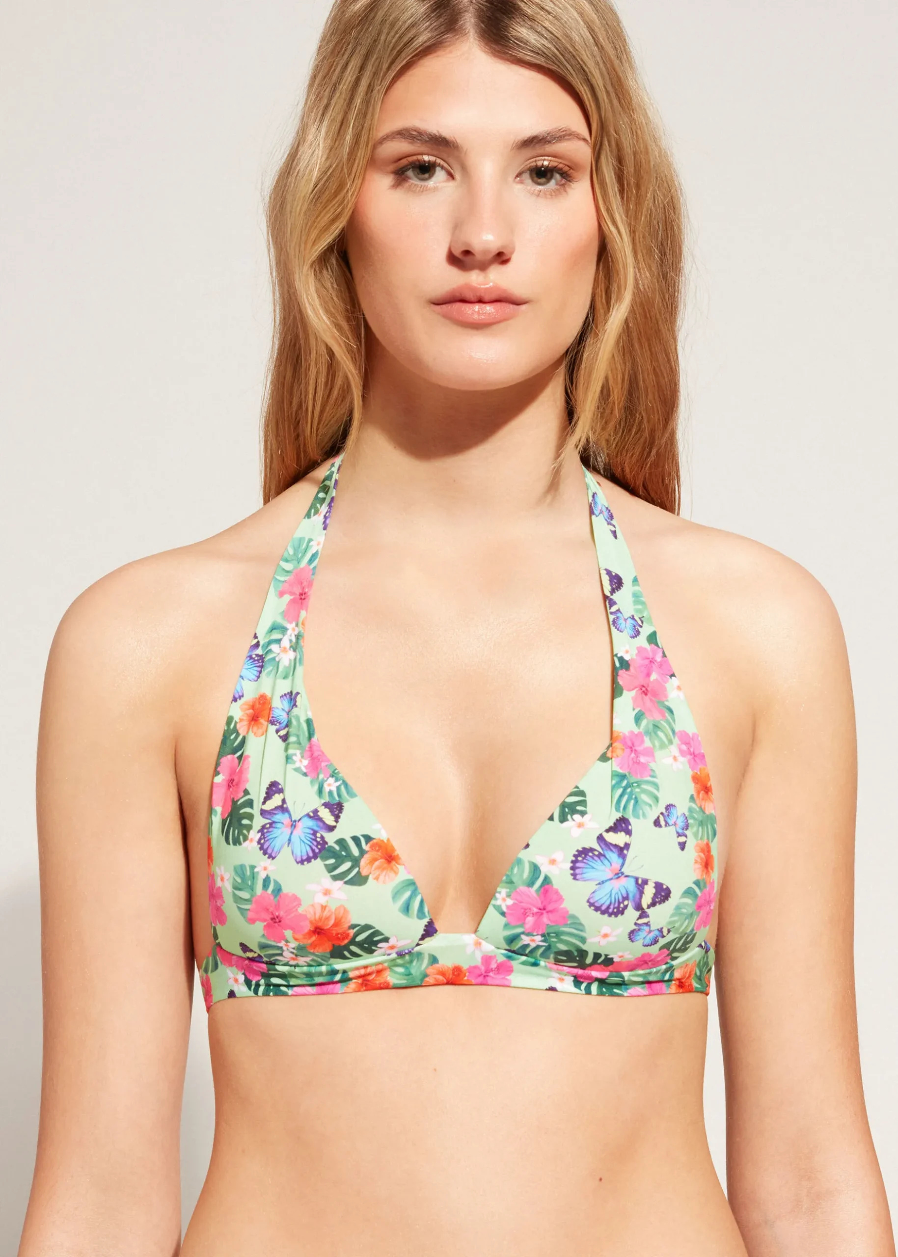 Non-Wired Fixed Triangle Bikini Top With Graduated Padded Cups That Add Volume To Enhance The Cleavage. The Style Features A Tropical Print In Bright Colours And Contrasting-Colour Lining. The Shoulder Straps Have Eyelets On The Ends So They Can Be Hooked Onto The Back Band Or Tied Around The Neck. Back Tie Fastening.