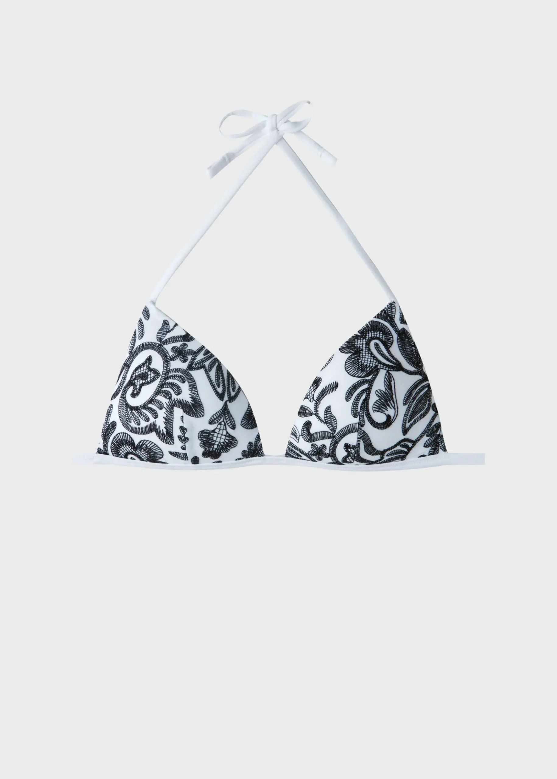 Non-Wired Fixed Triangle Bikini Top With Graduated Padded Cups That Add Volume To Enhance The Cleavage. The Style Features An Elegant Paisley Embroidery With A Retro Feel. The Shoulder Straps Have Eyelets On The Ends So They Can Be Hooked Onto The Back Band Or Tied Around The Neck. Narrow Tie Fastening At The Back.