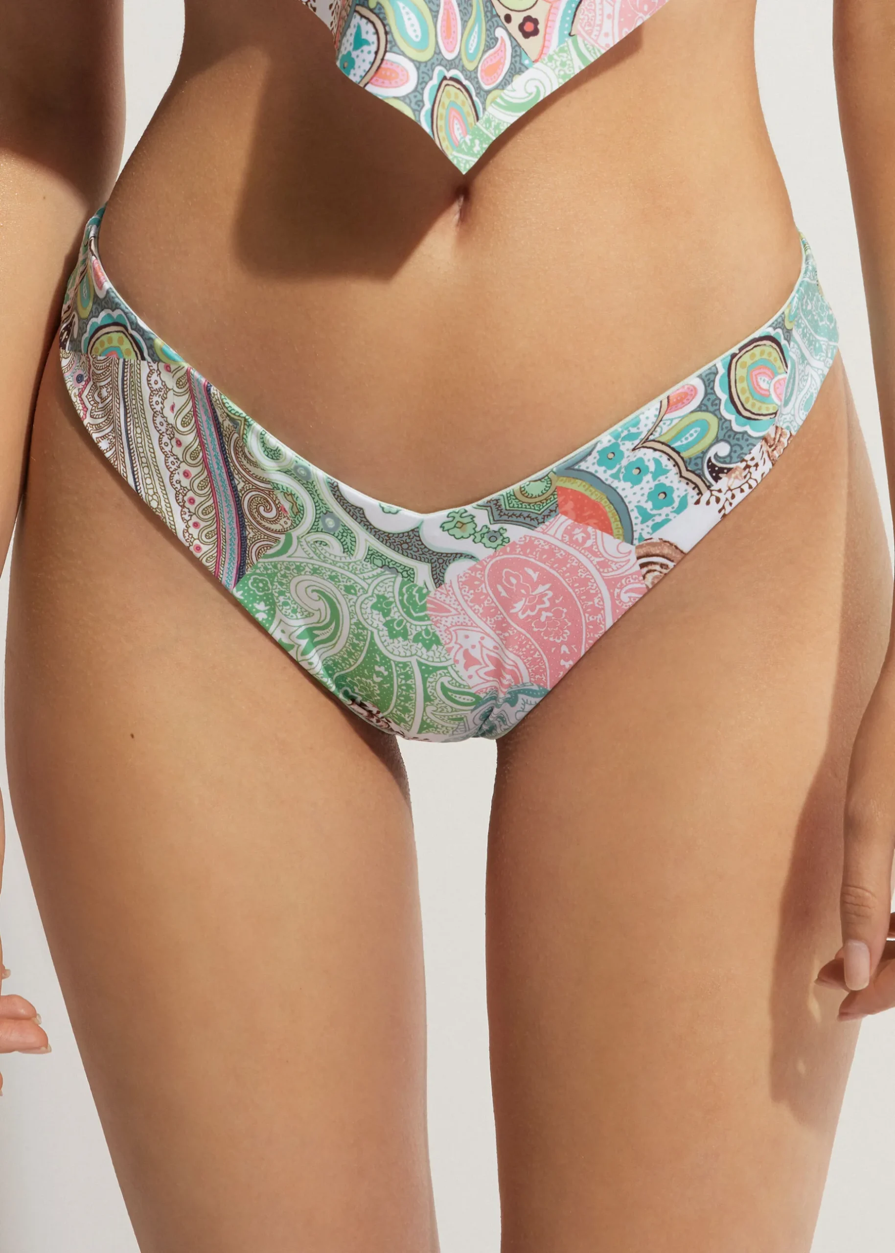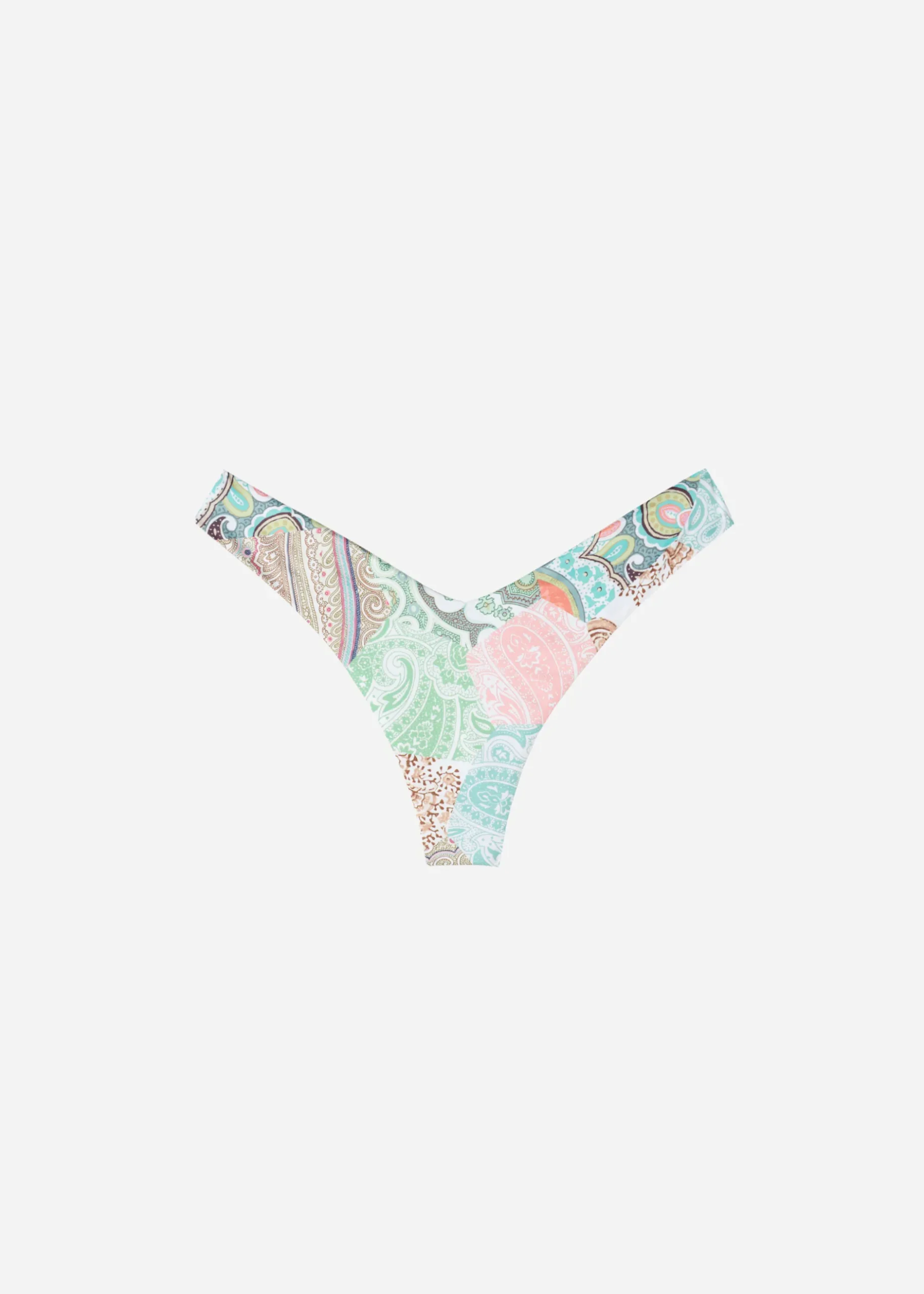 Brazilian Bikini Bottoms With V-Cut Front And Back, And 80S-Style High Leg. The Microfibre Fabric Features A Paisley Patchwork Pattern In Pale Hues. Fully Lined And With Invisible Seams For A Smooth Shape. With A Central Seam In The Back To Ensure A Better Fit.