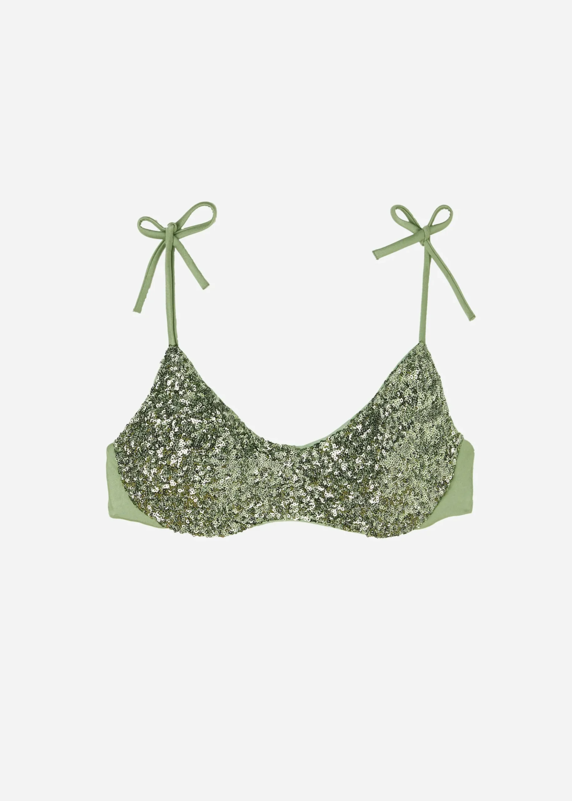 Underwired Crop Bikini Top With Cups With Removable Padding. The Shine Microfibre Fabric Is Embellished With Elegant Tone-On-Tone Sequins. Adjustable Spaghetti Straps That Tie At The Shoulder. Back Tie Fastening.