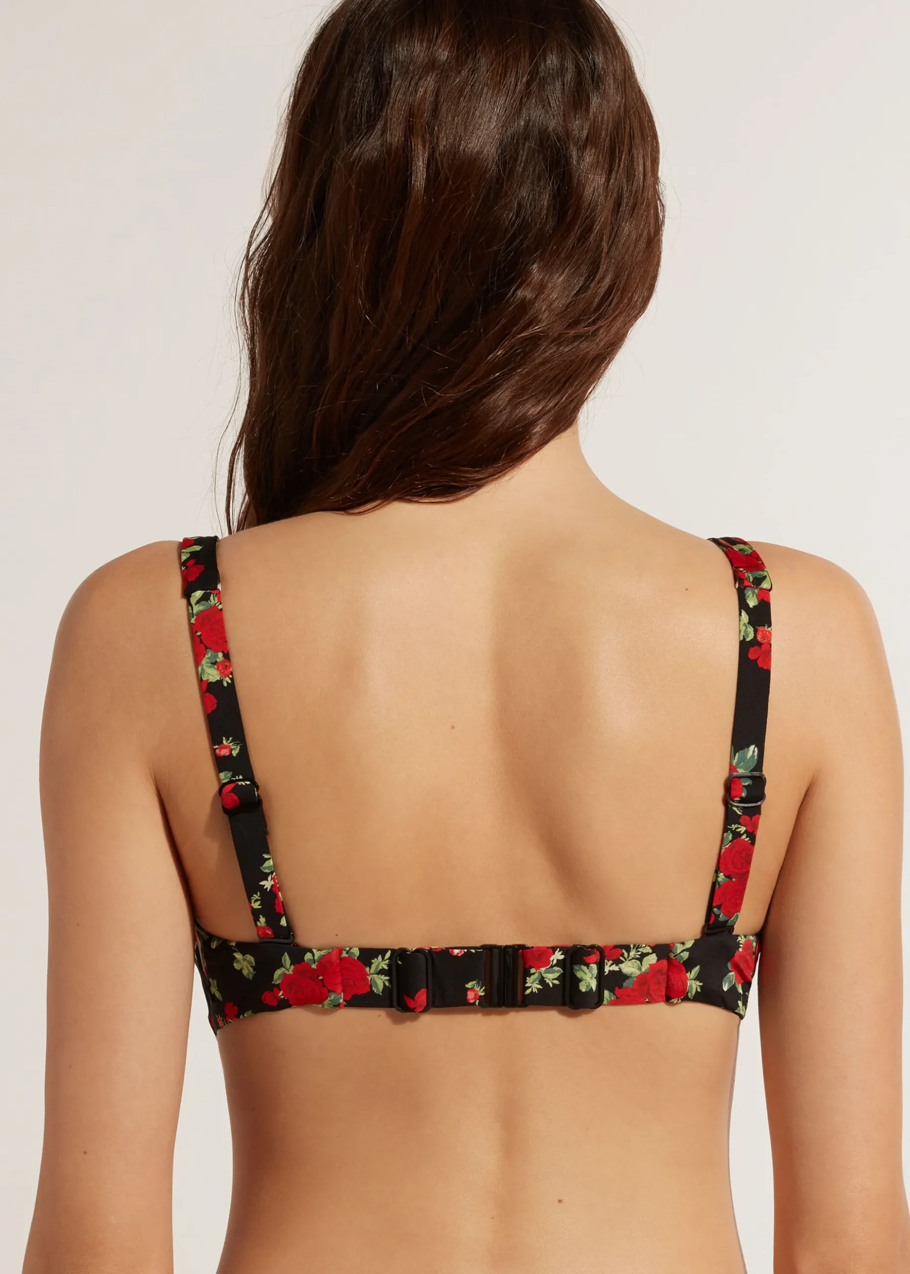 Non-Padded Balconette Bikini Top With Underwire. The Structure Of The Cups And The Wide Fit At The Sides Provide Good Support For The Larger Bust. The Inside Of The Cup Is Lined With Tulle To Ensure Greater Support. The Style Features An Elegant Red Rose Pattern Combined With An Animal Print On The Inner Lining. Adjustable, Detachable Shoulder Straps Can Be Crossed Over At The Back Or Tied Around The Neck. You Can Adjust The Point At Which The Shoulder Straps Hook Onto The Back As There Are Several Holes Along The Back Band. Back Fastening With Clasp And Double Adjusters To Improve The Fit Of The Band.