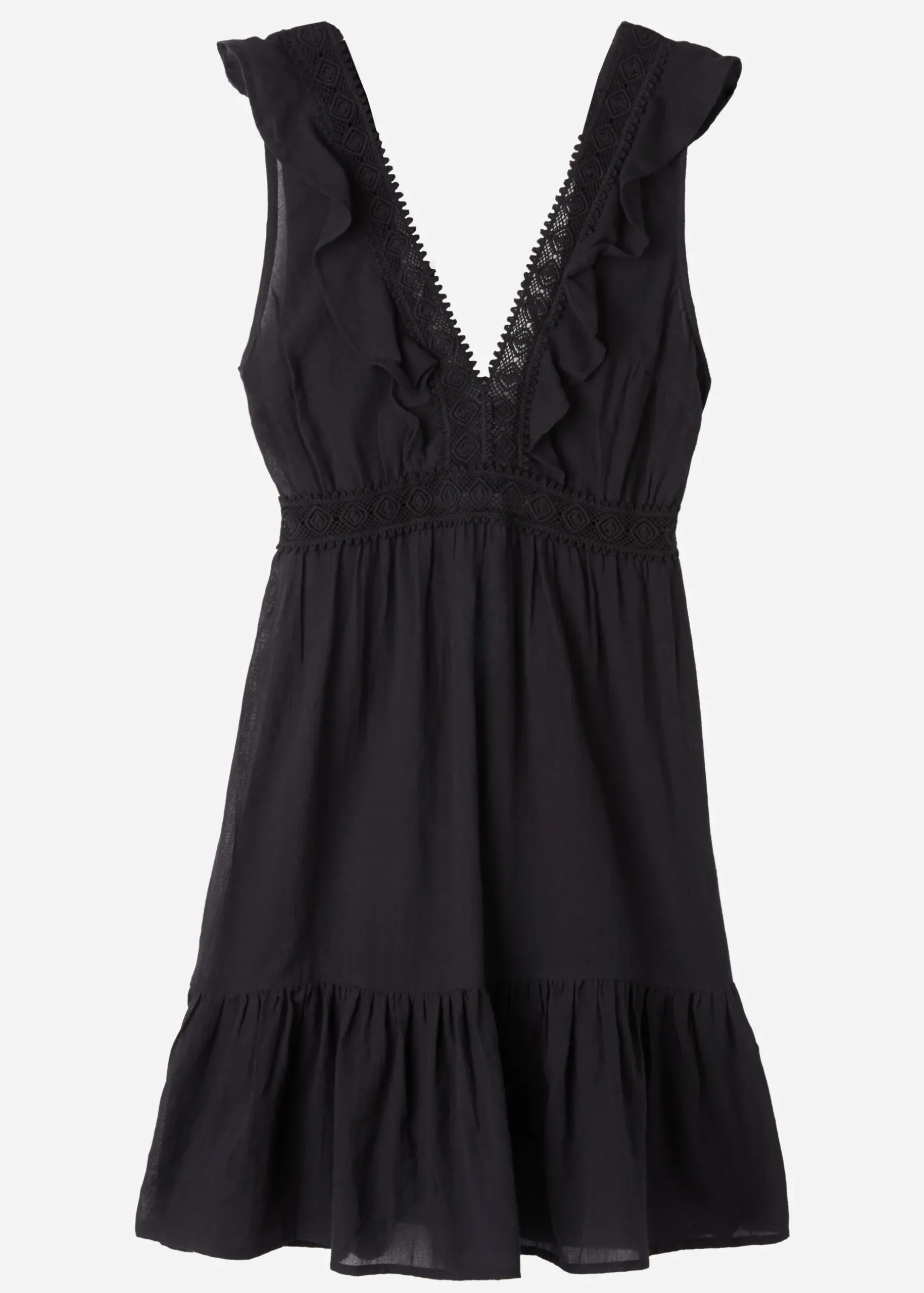 100% Cotton Short Dress Embellished With Ruffles And Passementerie On The Neckline And Below The Chest. The Thin Tie Fastening At The Back Emphasises The Plunging Back Neckline.