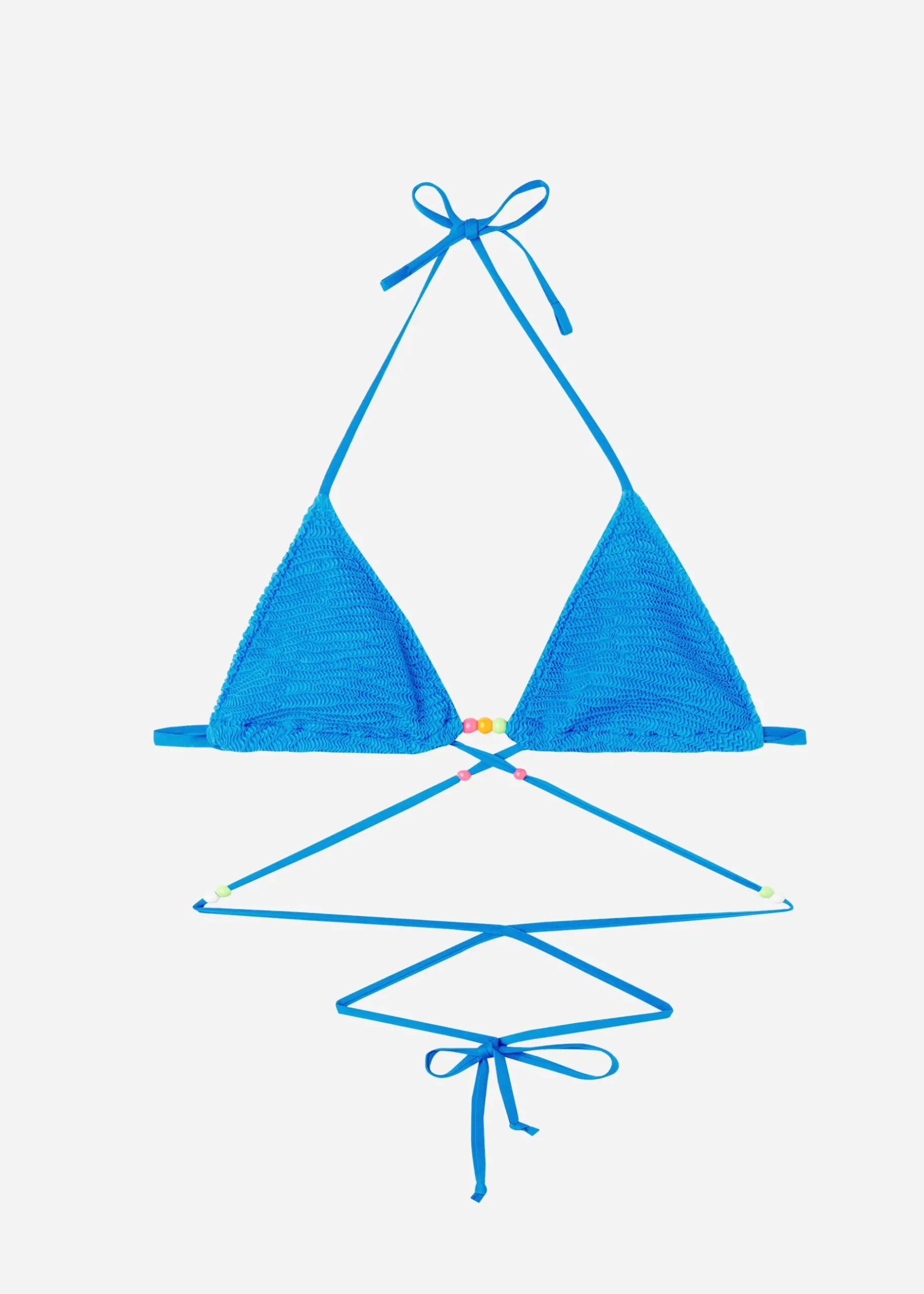 Non-Padded Slide Triangle Bikini Top.Long Thin Ties Can Be Wrapped Around The Body And Tied At The Back. The Style Features 3D-Effect Crinkle Fabric With Coloured Bead Details. The Shoulder Straps Have Eyelets On The Ends So They Can Be Hooked Onto The Back Band Or Tied Around The Neck. Thin Tie Fastening At The Back.