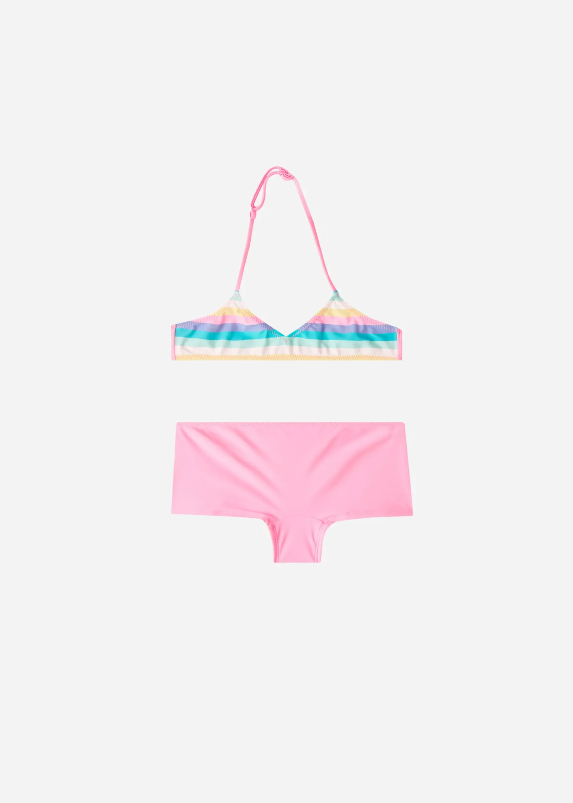 Girls’ Bikini With Triangle Top In Soft Microfibre With A Horizontal Stripe Pattern In Subtle Hues. One Adjustable Strap And Back Clasp Fastening. The Microfibre Shorts Have A Lined Gusset In Small Sizes, While Sizes 12-14 Are Fully Lined At The Front.