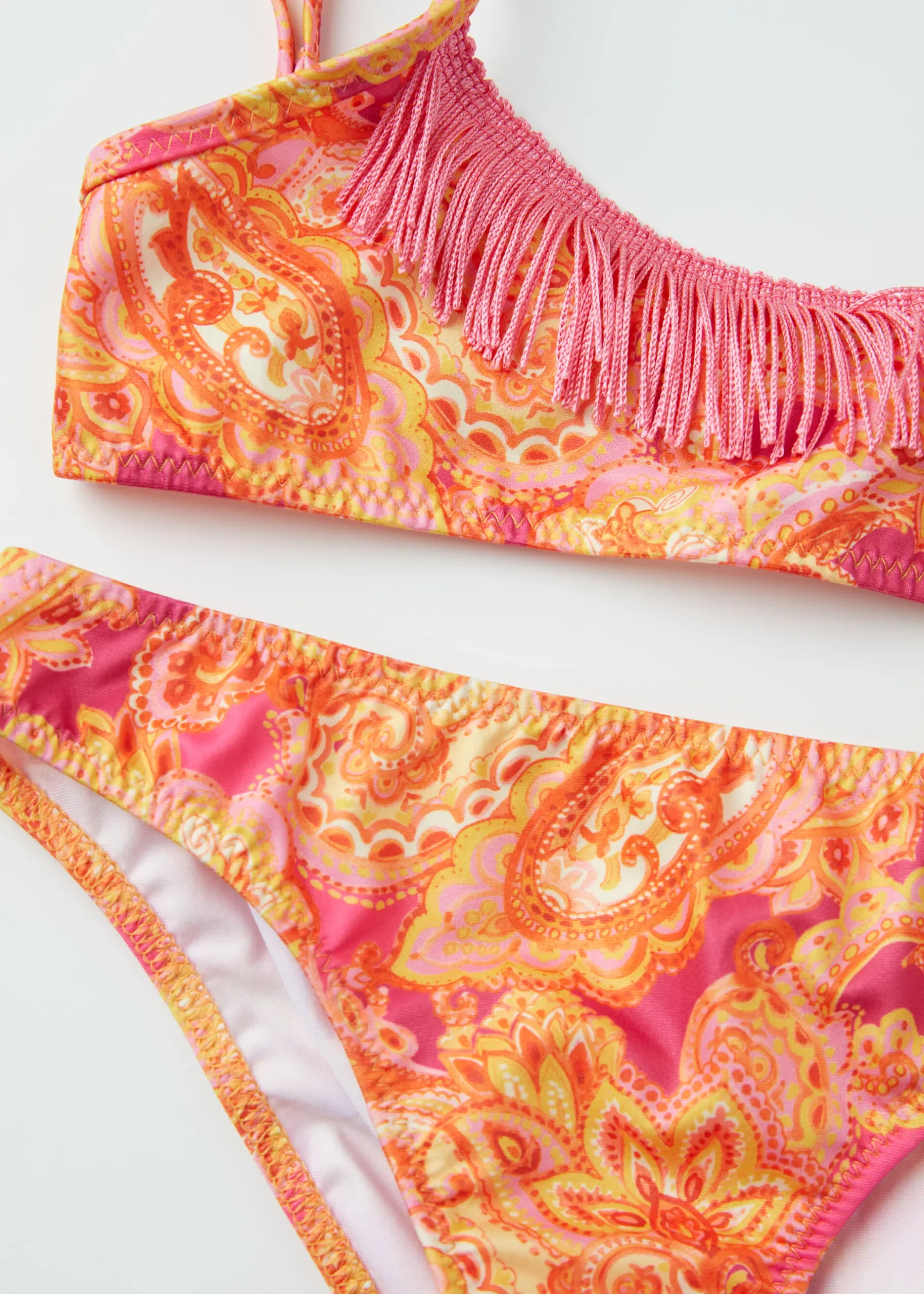 Girls’ Bikini With Brassiere Top In Soft Microfibre Fabric With A Paisley Pattern Embellished With Fringed Passementerie On The Neckline. Adjustable Shoulder Straps And Back Clasp Fastening. The Bikini Bottoms Have A Lined Gusset In Small Sizes, And Sizes 12-14 Are Fully Lined At The Front.