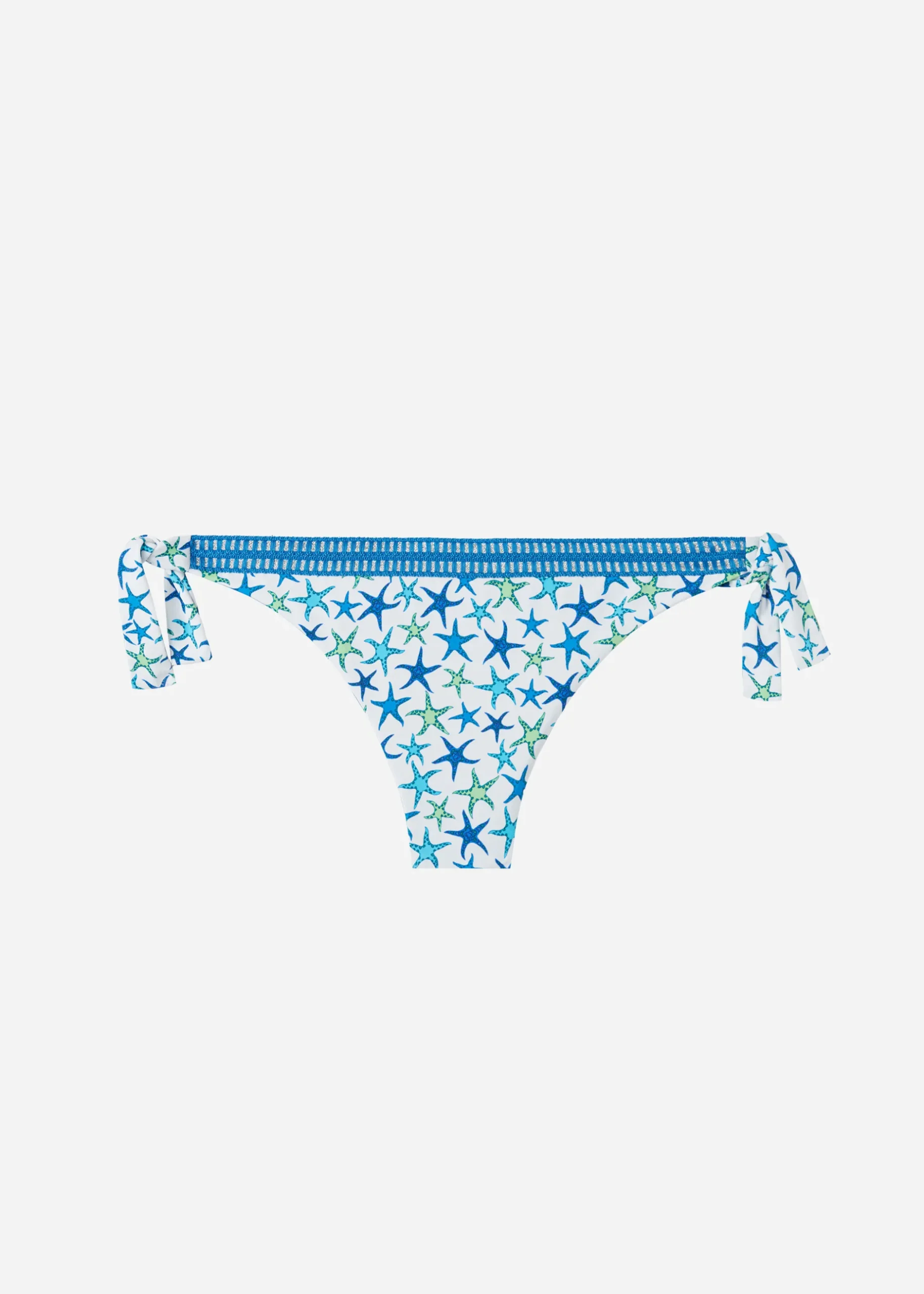 Brazilian Bikini Bottoms With Bow Fastening At The Hips To Adjust The Fit. The Style Features A Navy Star Pattern And Sparkly Rhinestones, While A Pretty Crochet Passementerie Adds Definition To The Edges. Fully Lined With Invisible Seams. Central Seam At The Back To Ensure A Better Fit.