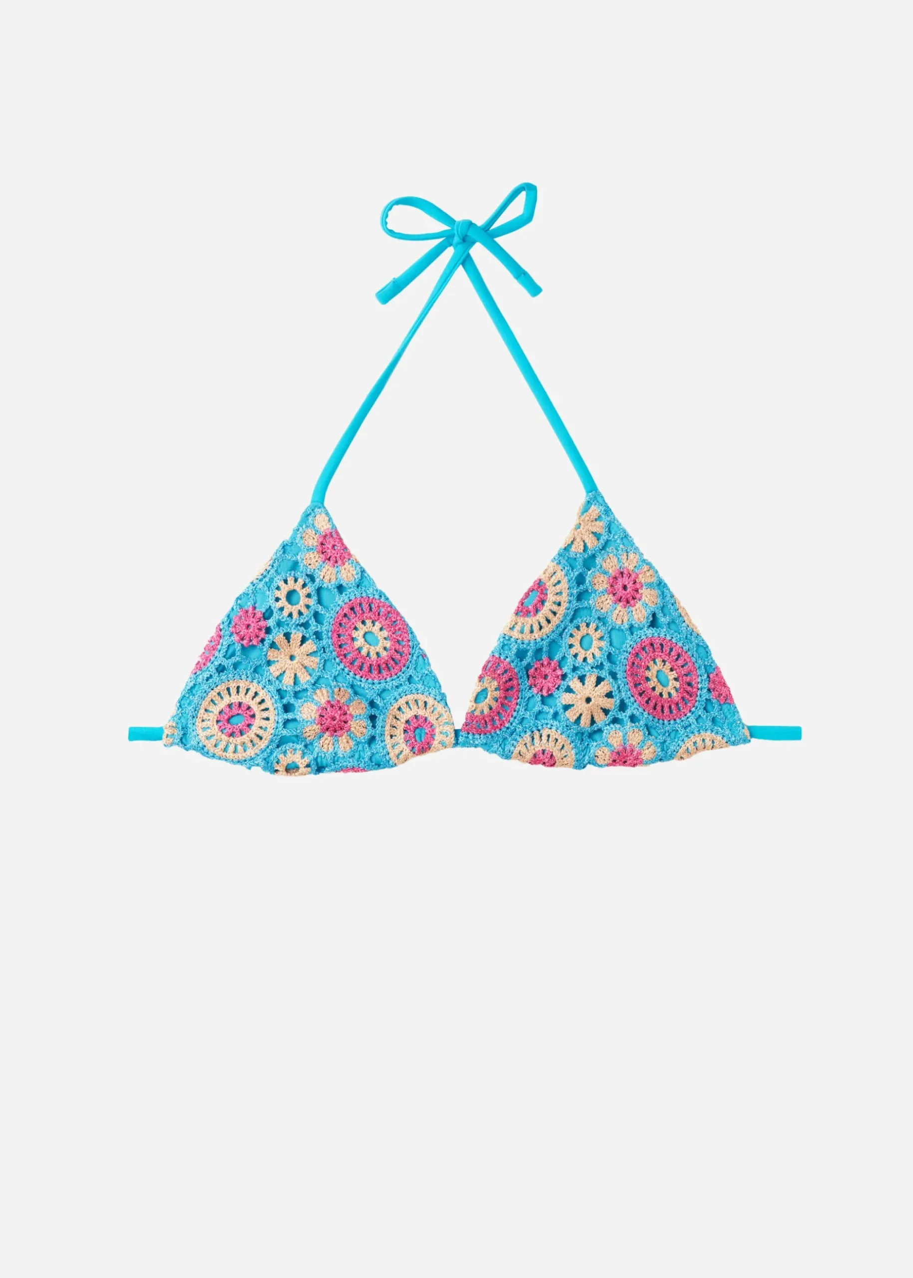 Slide Triangle Bikini Top With No Underwire Or Padding For A Natural Effect. The Style Stands Out Thanks To The Crochet-Effect Detailing In Bright Colours. The Shoulder Straps Have Eyelets On The Ends So They Can Be Hooked Onto The Back Band Or Tied Around The Neck. Thin Tie Fastening At The Back.