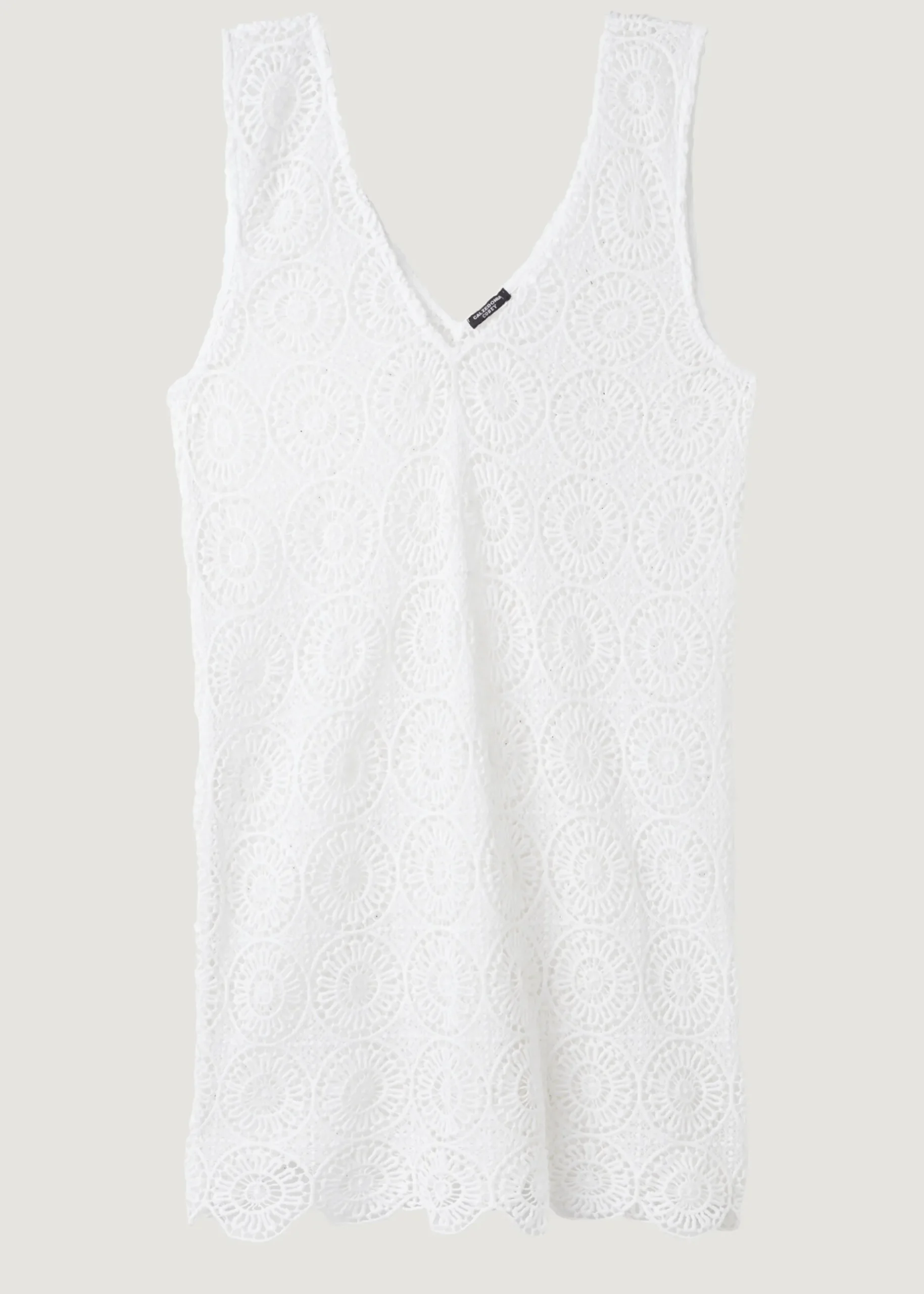 Sleeveless Dress With Plunging V-Neck, Featuring A Geometric Crochet Design. Above-The-Knee Length And Scallop Edge.