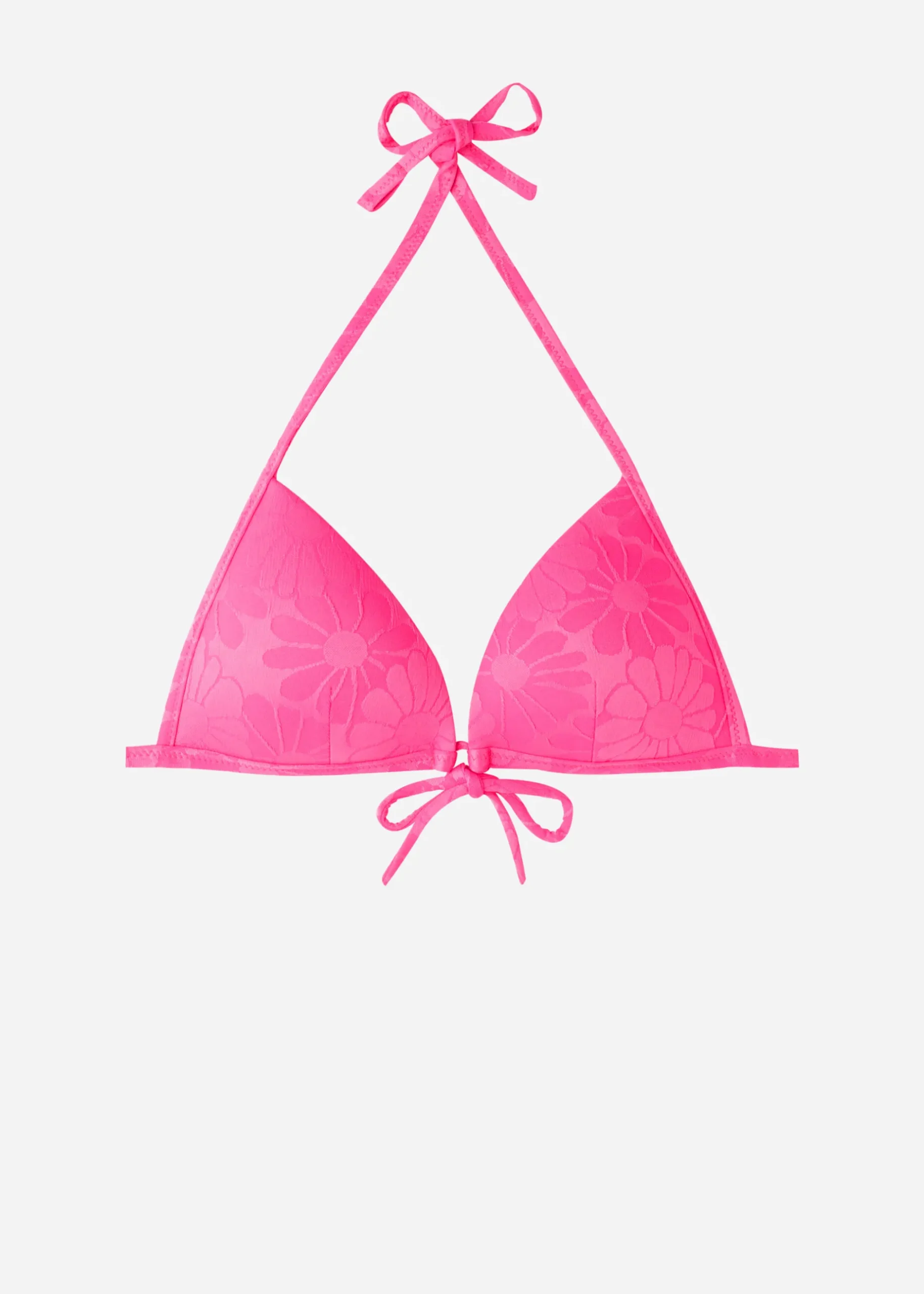 Non-Wired Fixed Triangle Bikini Top With Graduated Padded Cups That Add Volume To Enhance The Cleavage. The Style Features Tone-On-Tone Floral Jacquard Fabric And A Bow Detail On The Neckline To Adjust The Push-Up Effect. Contrasting-Colour Lining. The Shoulder Straps Have Eyelets On The Ends So They Can Be Hooked Onto The Back Band Or Tied Around The Neck. Thin Tie Fastening At The Back.