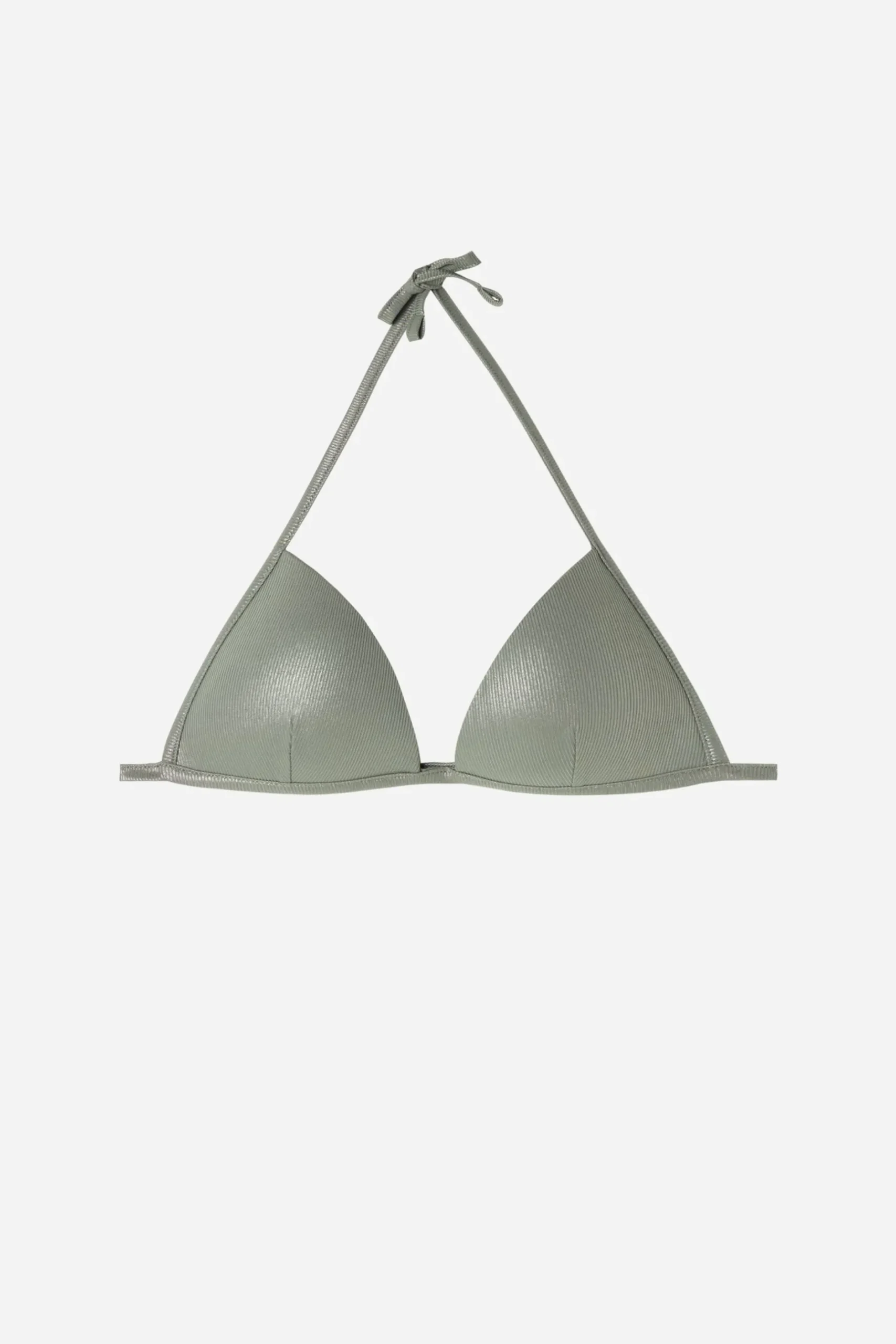 Non-Wired Fixed Triangle Bikini Top With Graduated Padded Cups That Add Volume To Enhance The Cleavage. The Style Features Micro-Rib Fabric With An Elegant Coated Effect. The Shoulder Straps Have Eyelets On The Ends So They Can Be Hooked Onto The Back Band Or Tied Around The Neck. Thin Tie Fastening At The Back.
