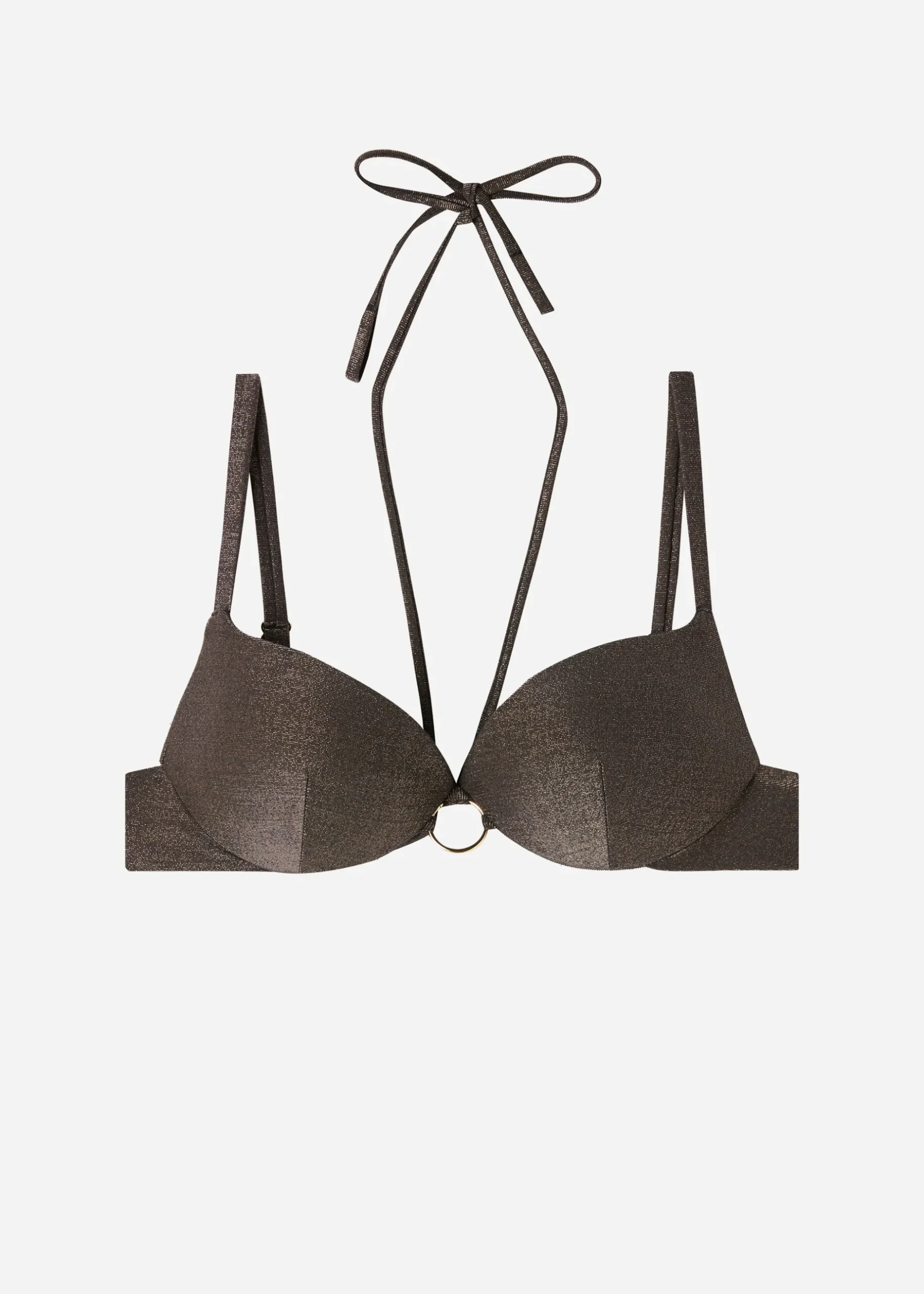 Push-Up Bikini Top With Graduated Padding And Underwiring To Add Volume To The Bust. In Size Xl / 5, Cups Are Lightly Padded. Soft Fabric Embellished With Sparkly Lame Thread And Embellished With A Nickel-Free Gold Ring. The Style Stands Out Thanks To A Long Removable Tie At The Cleavage That Ties Around The Neck. The Shoulder Straps Have Eyelets At The End And Can Be Fastened Onto The Back Band Or Tied In A Bow Around The Neck. Back Bow Fastening.