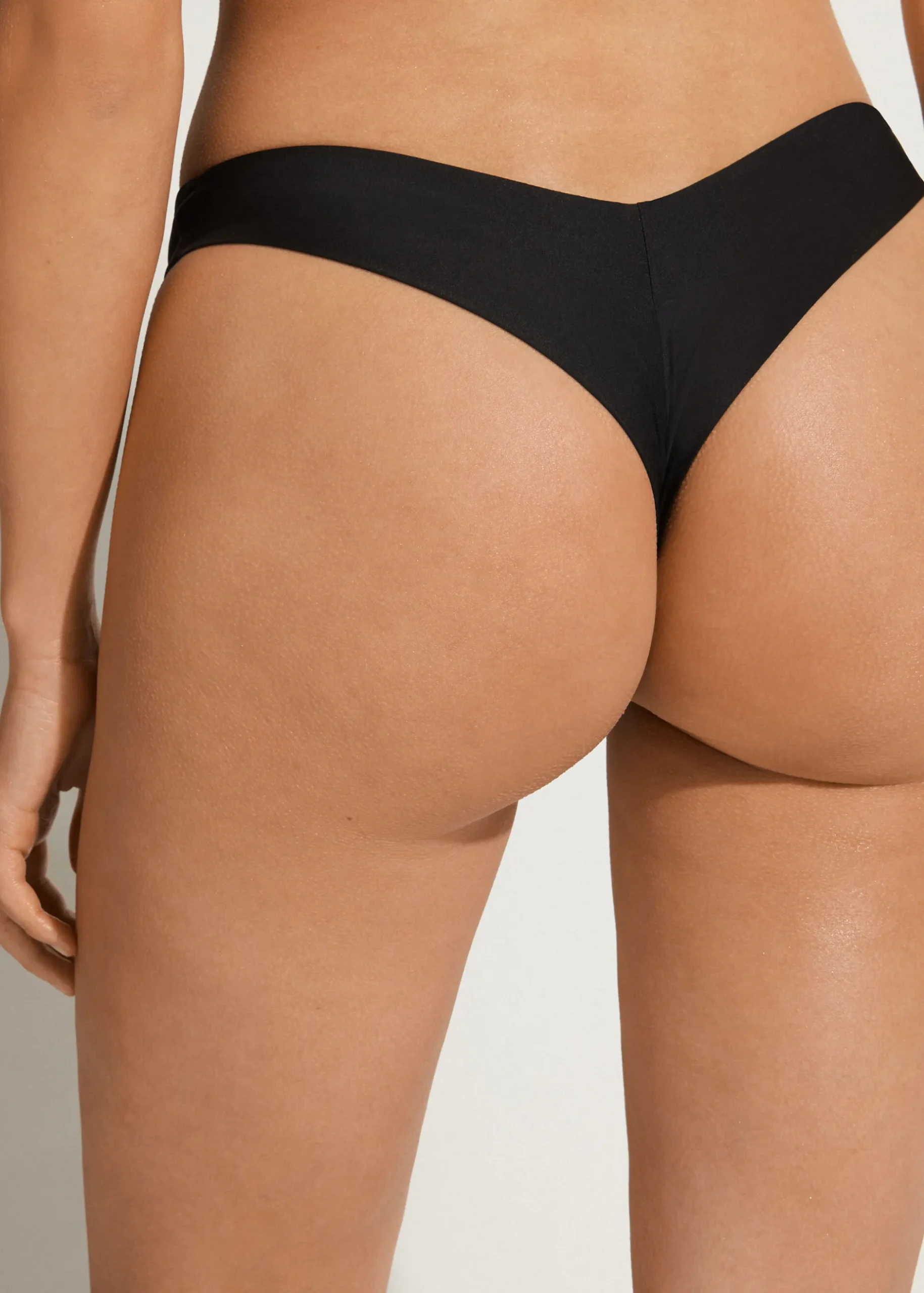 Brazilian Bikini Bottoms With V-Cut Front And Back, And 80S Style High Leg. Fully Lined And With Invisible Seams To Maintain A Continuous Shape. High-Cut Brazilian Rear. The Back Central Seam Ensures A Better Fit.