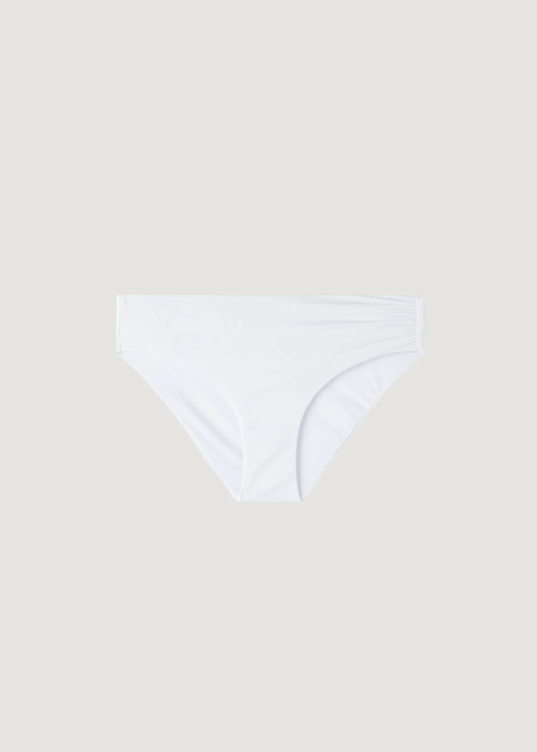 Bikini Bottoms With Slightly High Waist And Ruching On One Hip, With A Tummy Slimming Effect Thanks To The Unique Tulle At The Front. Fully Lined And With Invisible Seams To Maintain A Continuous Shape. More Coverage At The Rear.