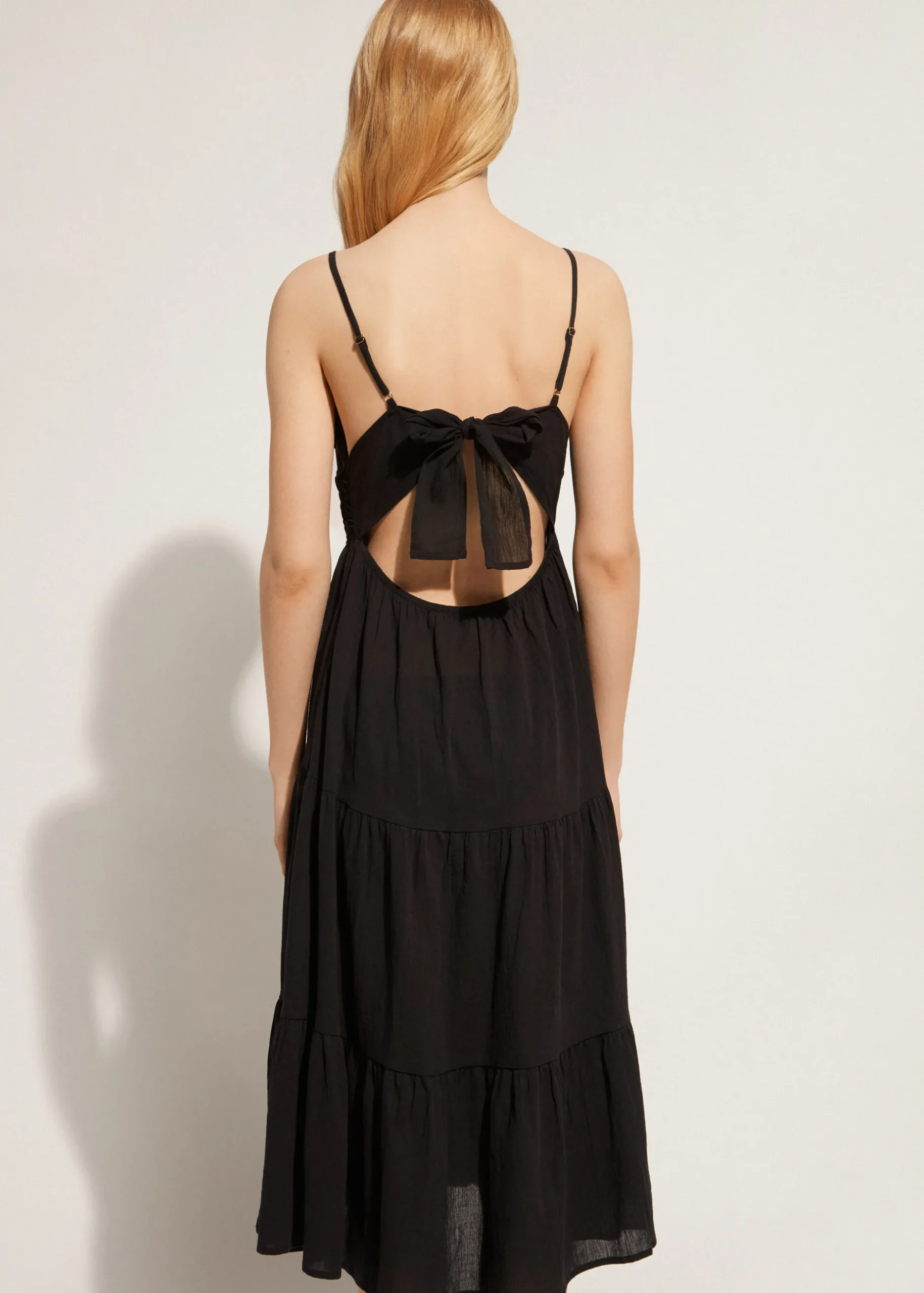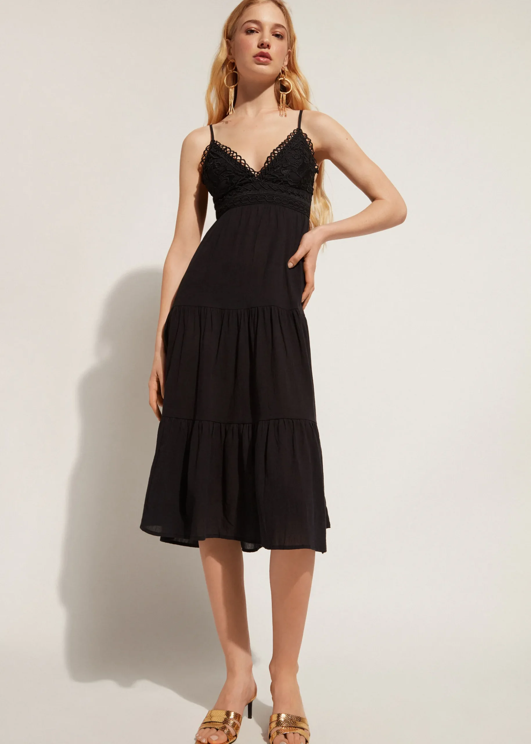 100% Cotton Macrame Lace Midi Dress With V-Neck. Adjustable Spaghetti Straps And Bow Fastening At The Back. Flounced Skirt.
