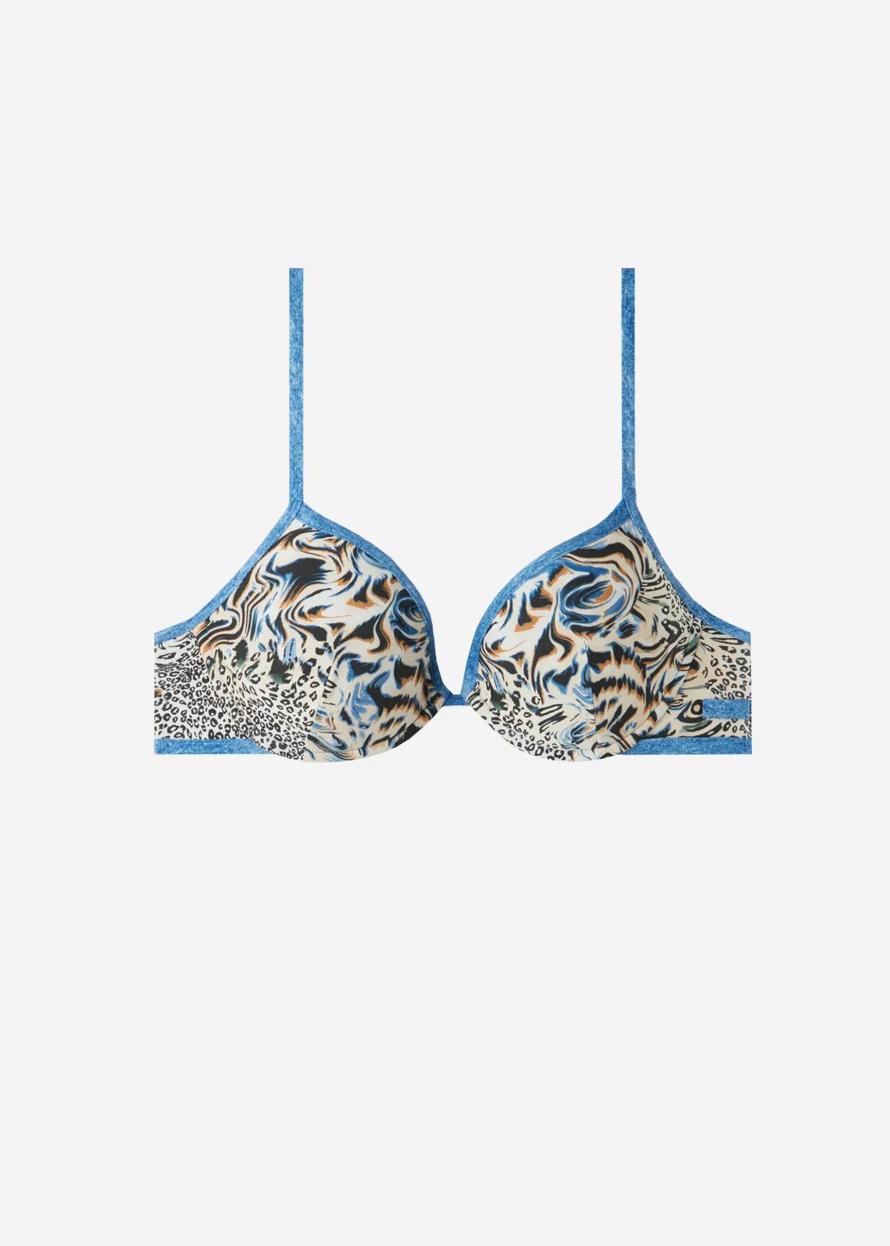 Push-Up Bikini Top With Lightly Padded Cups And Underwire For Support And Volume. The Style Features An Animal Print Defined By Blue Denim Edging. The Adjustable Shoulder Straps Have Eyelets On The Ends So They Can Be Hooked Onto The Back Band Or Tied Around The Neck. Back Fastening With Clasp And Double Adjusters To Improve The Fit.