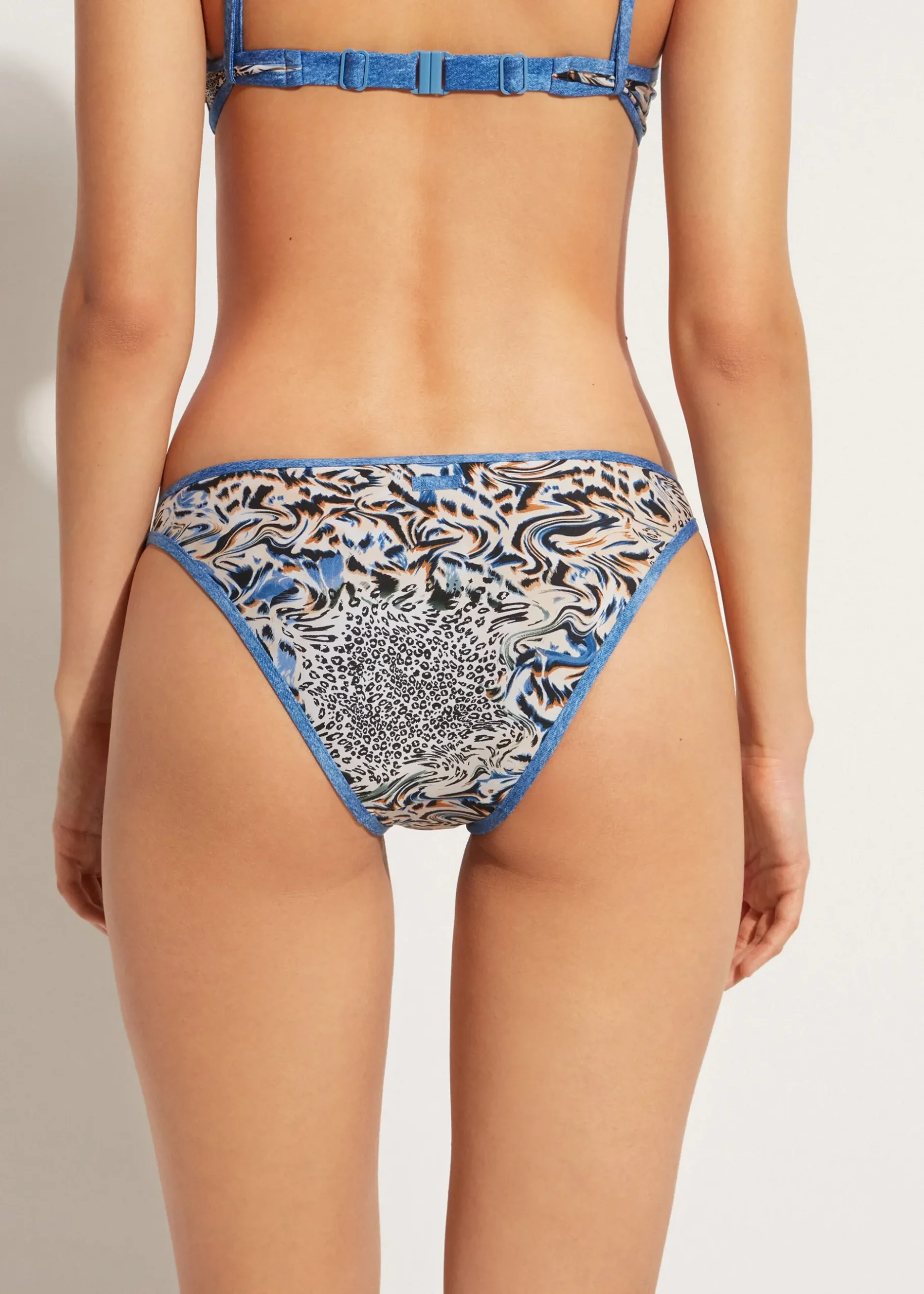 Fully Lined Double Face Bikini Bottoms With Invisible Seams. The Style Features A Double Face Pattern: Animal Print Defined By Blue Denim Edging On One Side And Blue Denim Tones On The Other.