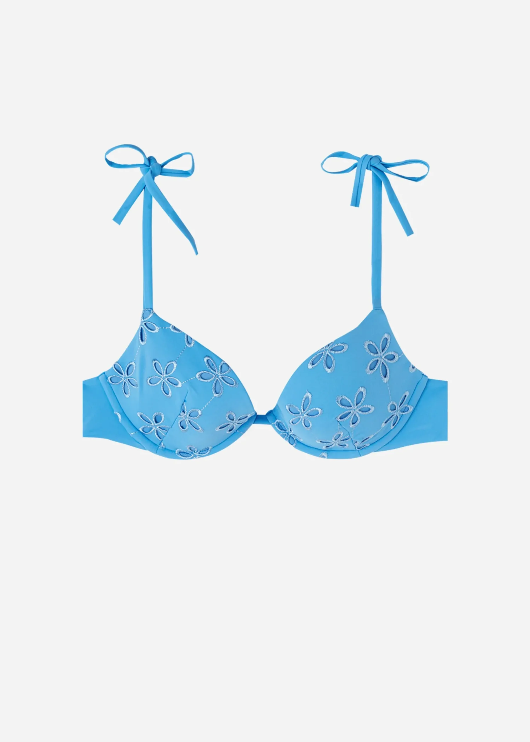 Push-Up Bikini Top With Underwire And Pre-Formed Cups. The Style Features Elegant Broderie Anglaise Fabric. Shoulder Straps With Bow Fastening To Adjust The Fit. Back Tie Fastening.