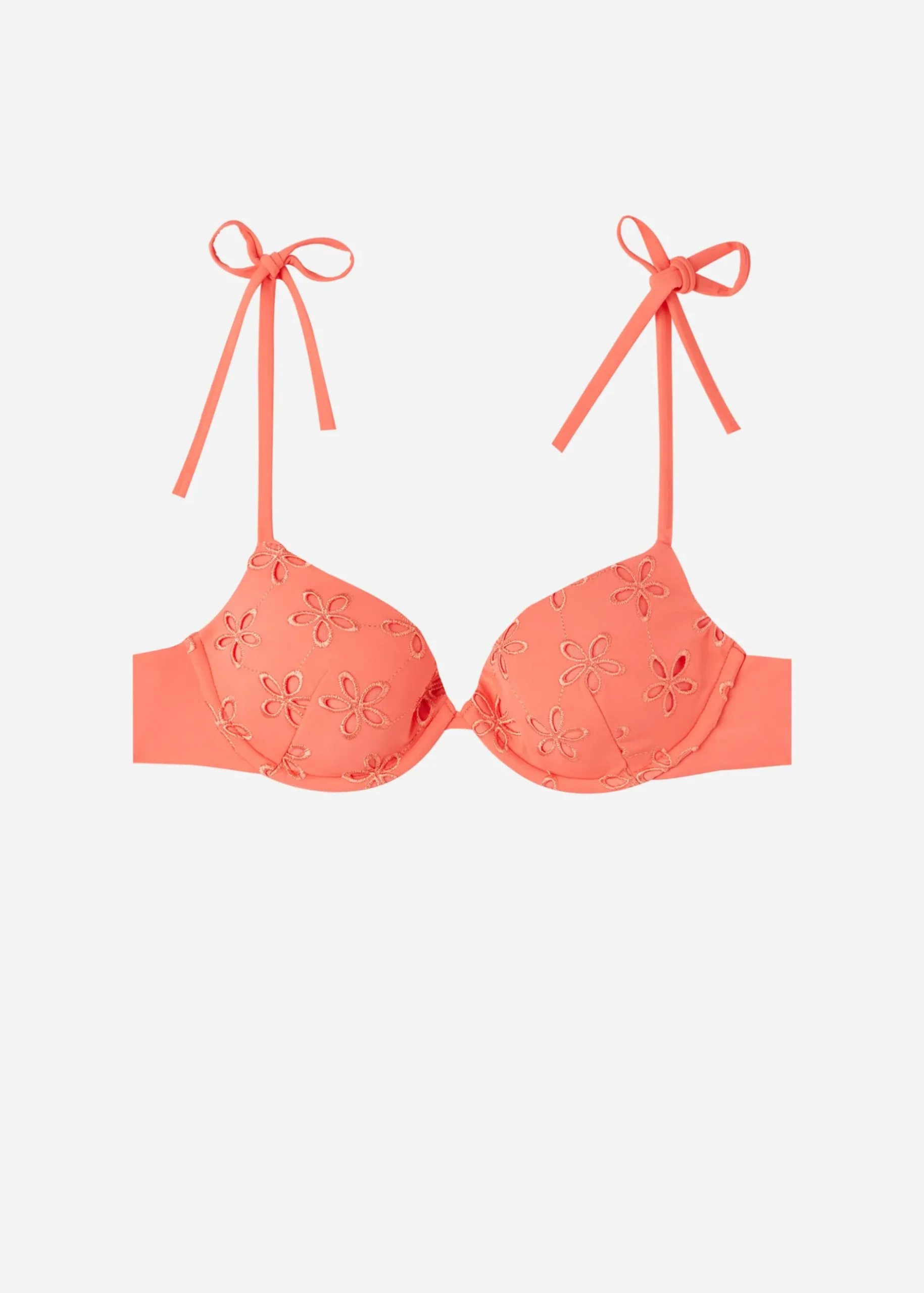 Push-Up Bikini Top With Underwire And Pre-Formed Cups. The Style Features Elegant Broderie Anglaise Fabric. Shoulder Straps With Bow Fastening To Adjust The Fit. Back Tie Fastening.
