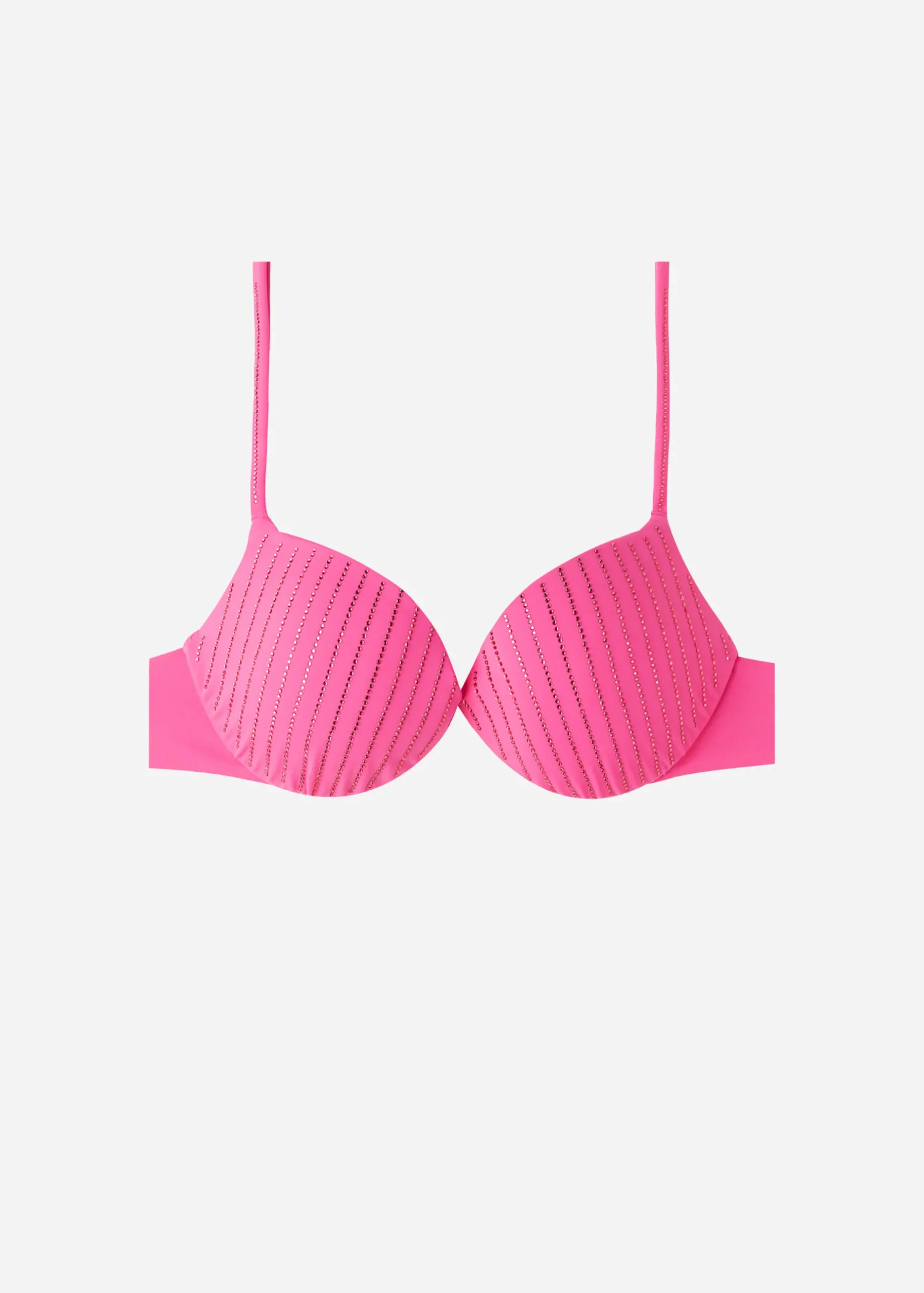 Push-Up Bikini Top With Pre-Formed Cups And Underwire For Support And Volume. Soft Microfibre Embellished With Sparkly Diamante In Vertical Stripes. The Shoulder Straps Have Eyelets On The Ends So They Can Be Hooked Onto The Back Band Or Tied Around The Neck. Back Tie Fastening.