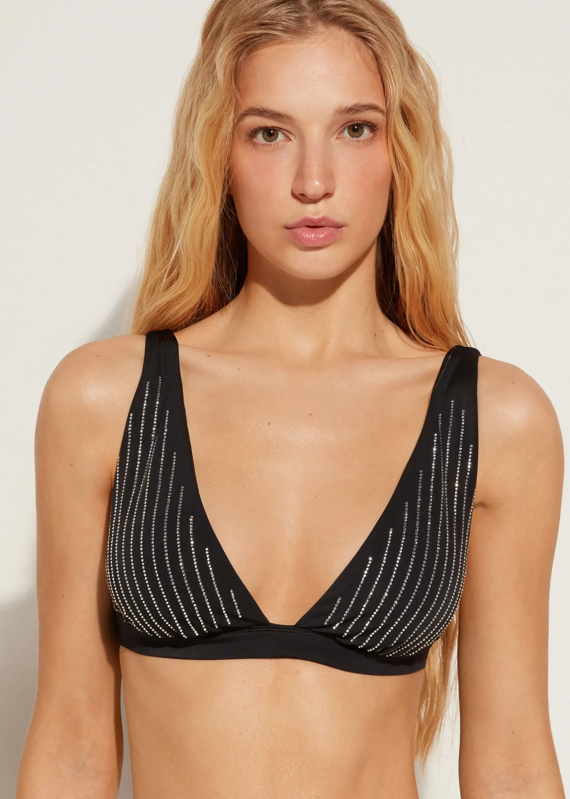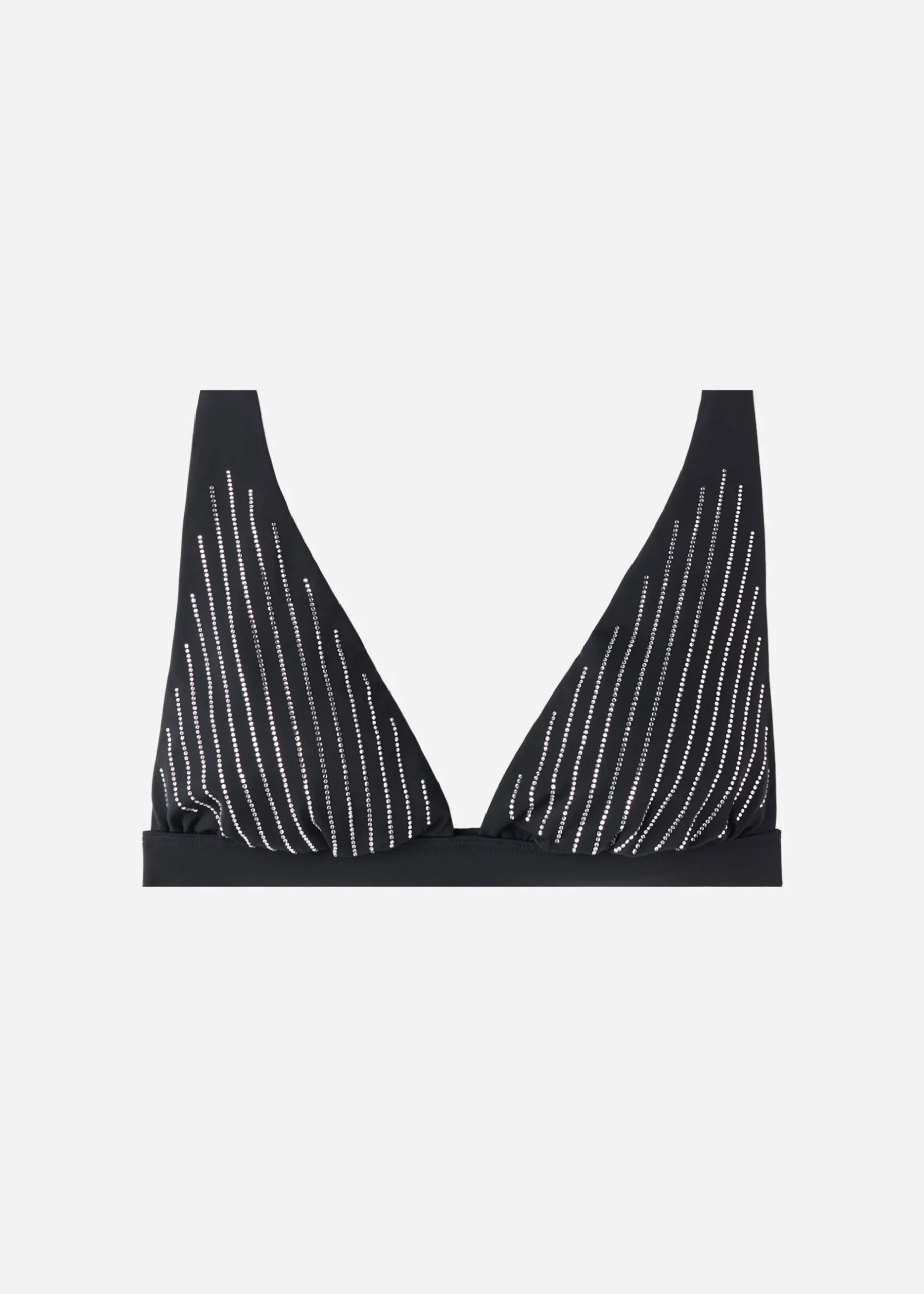 Non-Wired Triangle Bikini Top With Lightly Padded Cups. Reinforced Elastic Underband For Extra Support. Soft Microfibre Embellished With Sparkly Diamante In Vertical Stripes. Adjustable, Detachable Shoulder Straps That Can Be Crossed Over At The Back Or Tied Around The Neck. Back Tie Fastening.