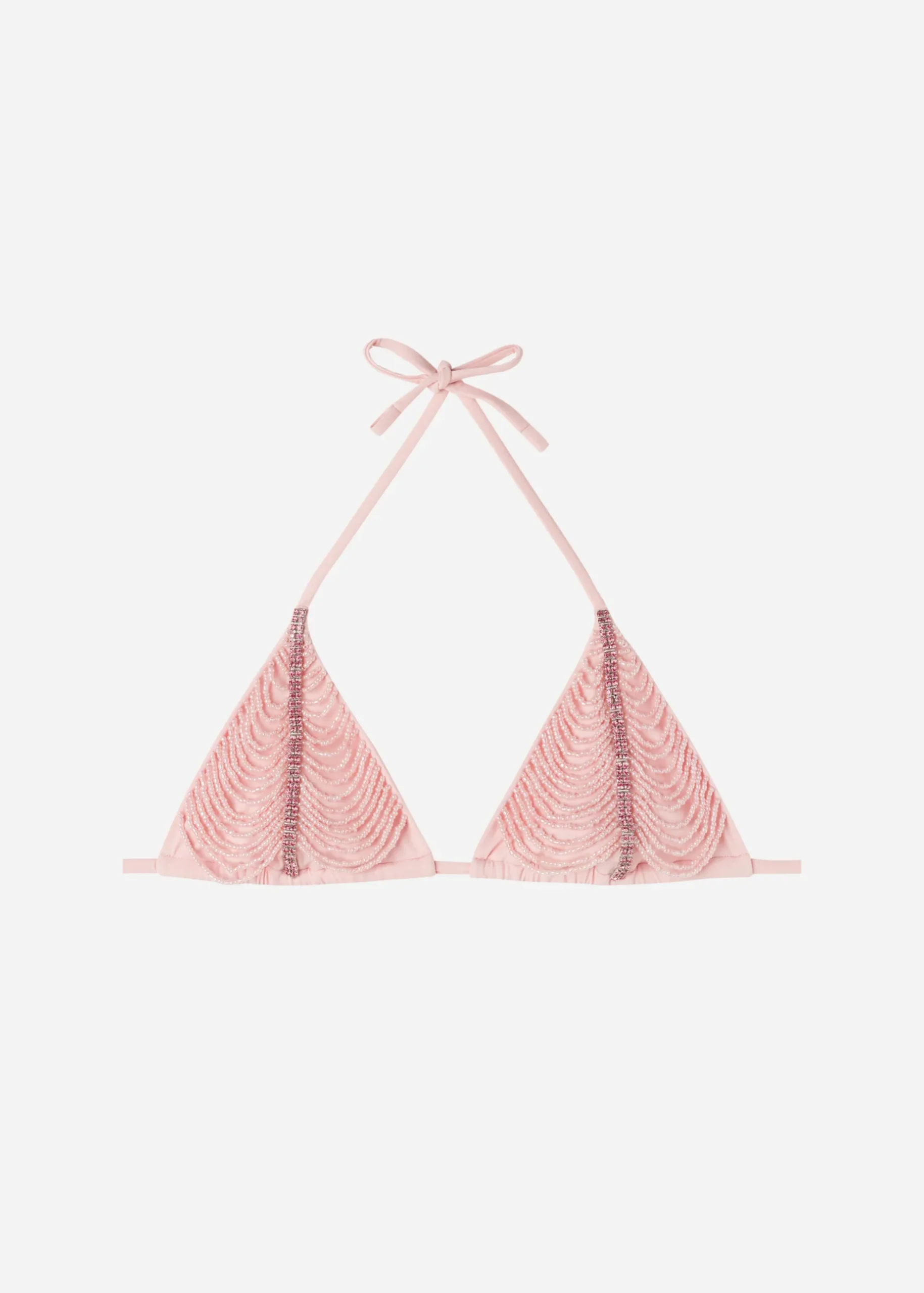 Slide Triangle Bikini Top With No Underwire Or Padding For A Natural Effect. Luxurious Play Of Shiny Tone-On-Tone Rhinestones And Pearls. The Shoulder Straps Have Eyelets On The Ends So They Can Be Hooked Onto The Back Band Or Tied Around The Neck. Thin Tie Fastening At The Back.